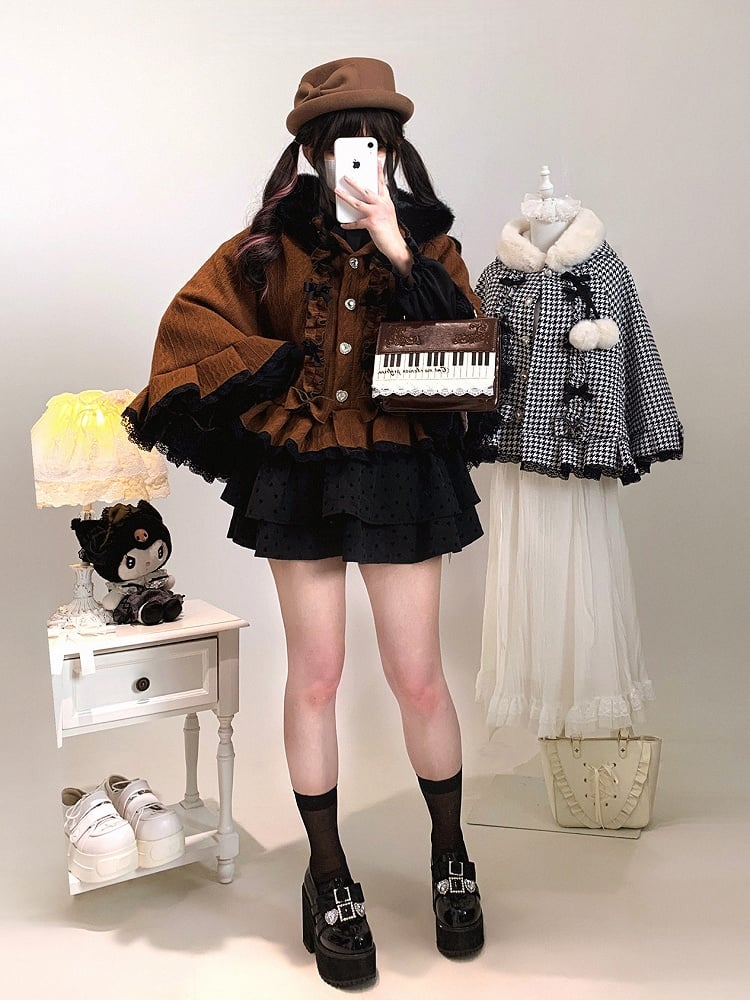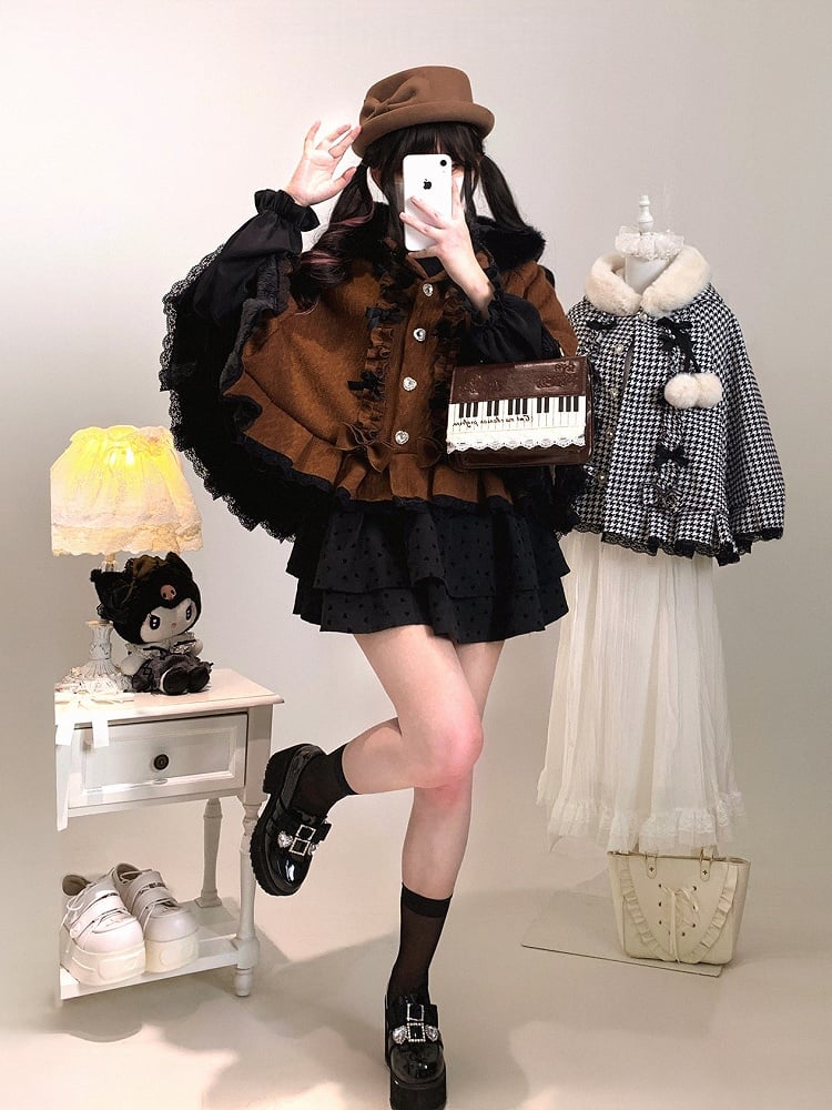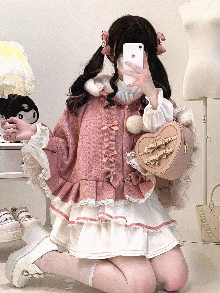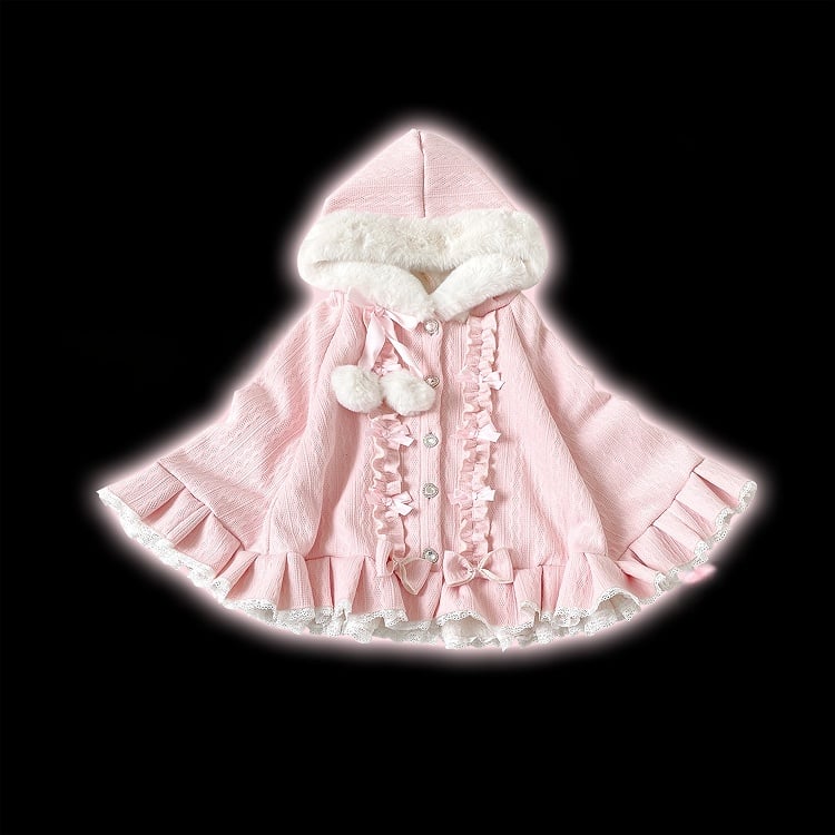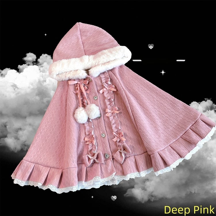 Available in 4 colors tailored for Jirai Kei styling, this cape is crafted from fleece-lined knitted fabric—balancing winter warmth with a soft, skin-friendly feel. The plush-trimmed hood softens its silhouette, while layered ruffles, bows and pom-poms infuse sweet details, accented by rhinestone buttons; the lace ruffled hem adds a lively touch. The cape fits the body without bulkiness, blending sweet elements with its base tone, making it a perfect pick for daily Jirai Kei looks.