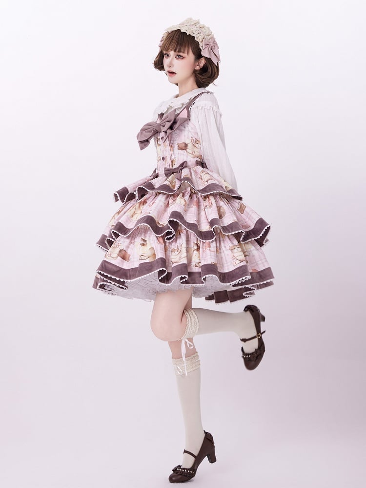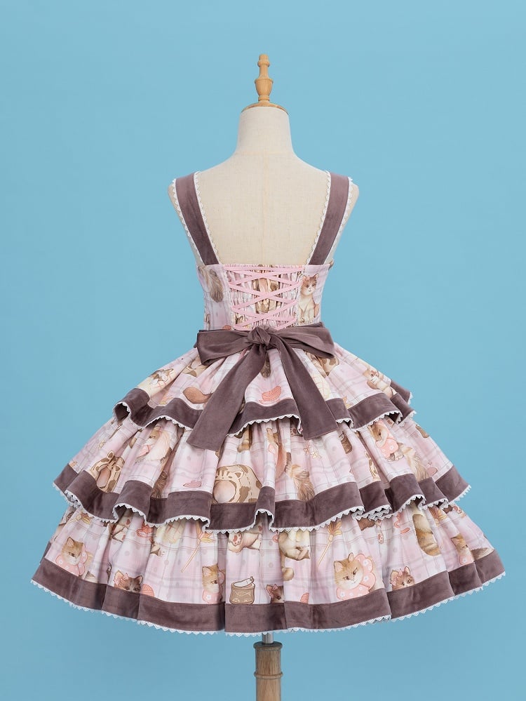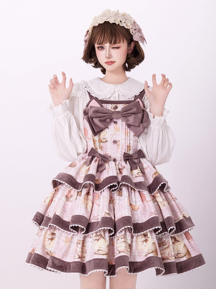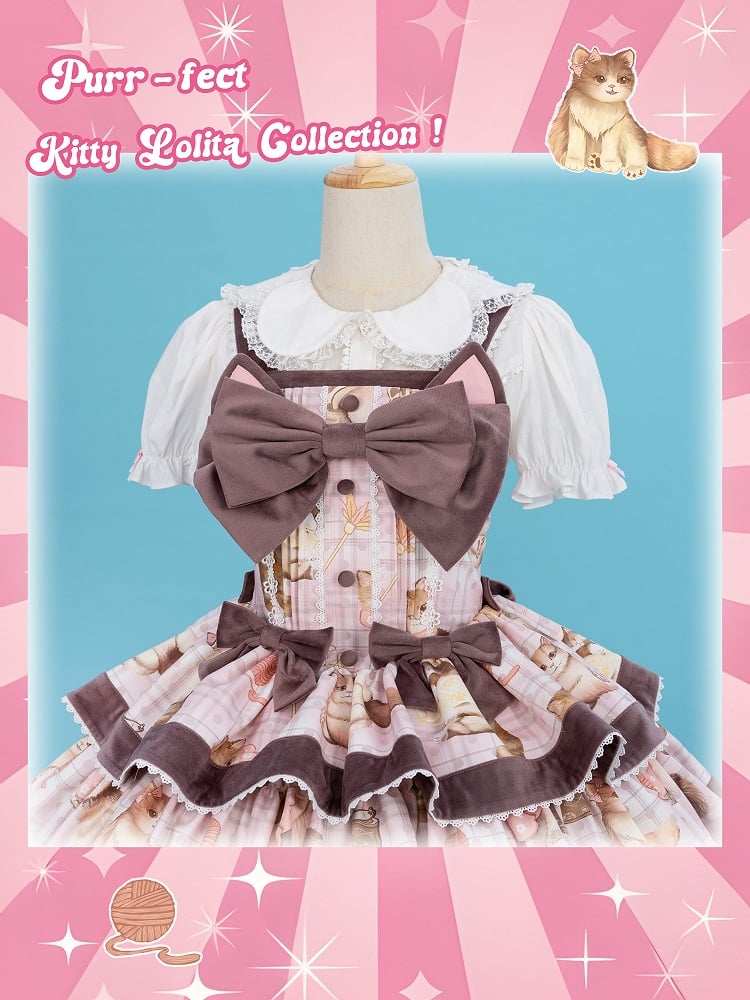 This enchanting dress features a captivating blend of plaid and polka dot patterns adorned with adorable kitty prints in various playful poses. The back of the dress boasts a comfortable smocked design with an adjustable lace-up, complemented by a convenient side zipper for the perfect fit. The waist is embellished with two charming bow accents, while the bodice is crowned with a large cat-ear bow, adding a touch of feline fantasy.