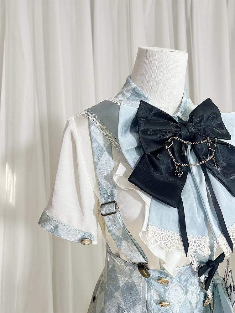 Paired with the shirt are the enchanting blue overall shorts, designed with a high waist and adorned with a captivating diamond pattern. An elastic band at the back and a convenient side zipper for easy wear, each leg of the shorts is embellished with a delicate bow, while the sides feature detachable gold chain decorations for a touch of luxe.