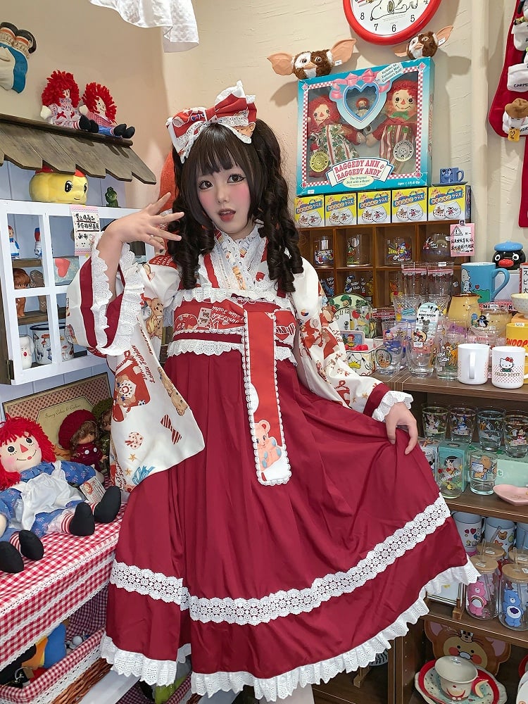 The set includes a beige top featuring an adorable bear print and a unique crossover design, adding a touch of whimsy to your look. Paired with a red JSK dress adorned with delicate lace trim, this ensemble captures the essence of Lolita fashion with a modern twist. Ideal for tea parties or any occasion where you want to express your individuality and love for Kimono culture, this set promises to make you feel both cute and sophisticated.