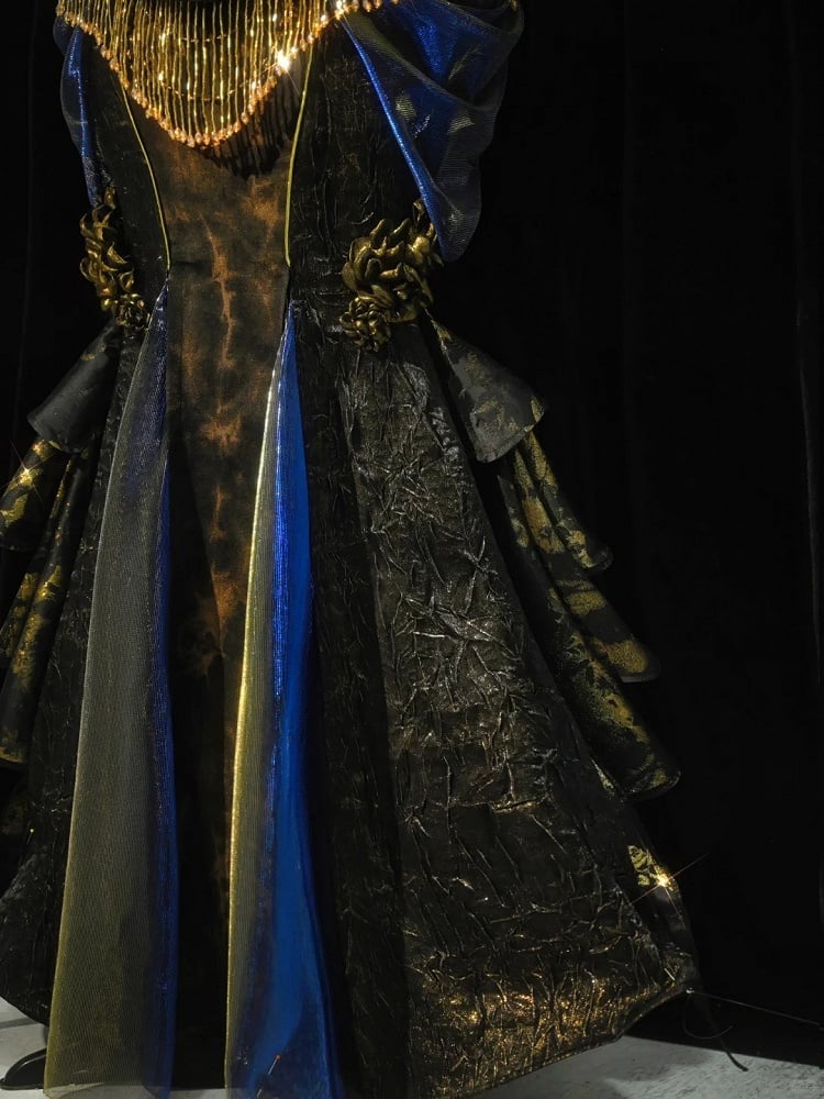 The skirt comes adorned with removable roses pin and a delicate bead chain, allowing you to customize your look effortlessly. These exquisite embellishments add a romantic and ethereal charm to the ensemble, making it perfect for gothic events, themed parties, or simply to make a bold fashion statement.