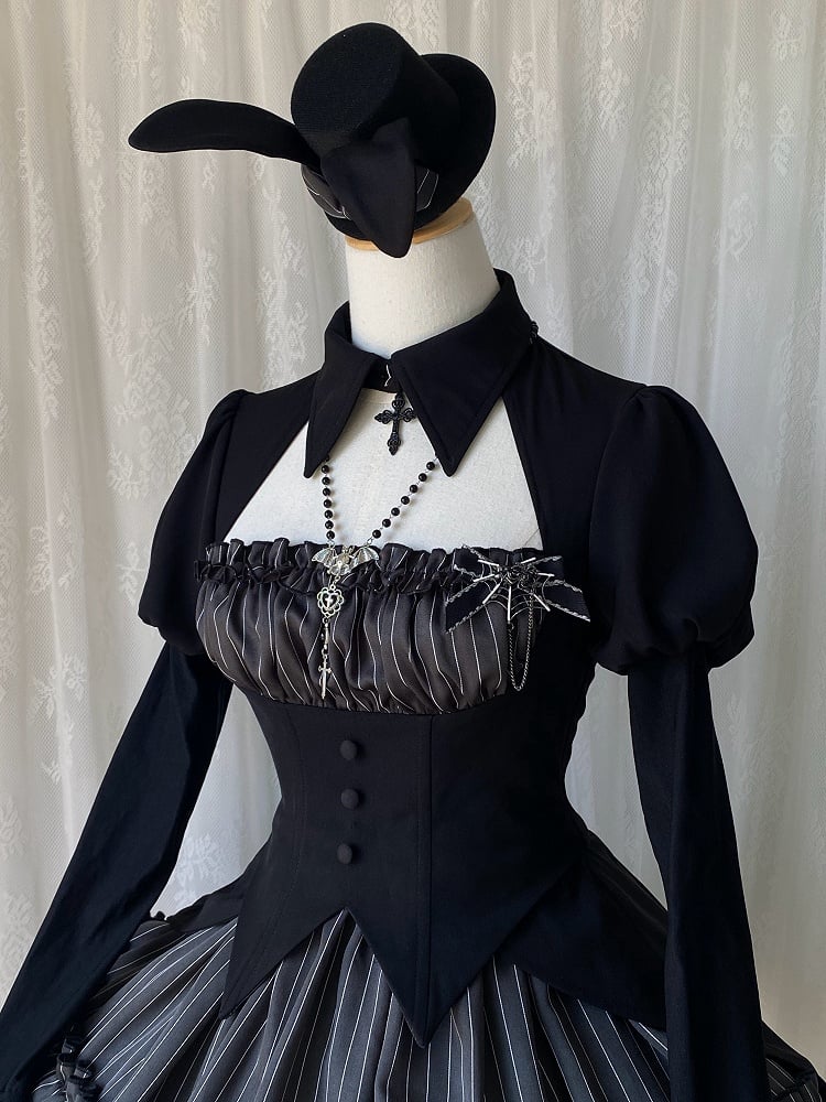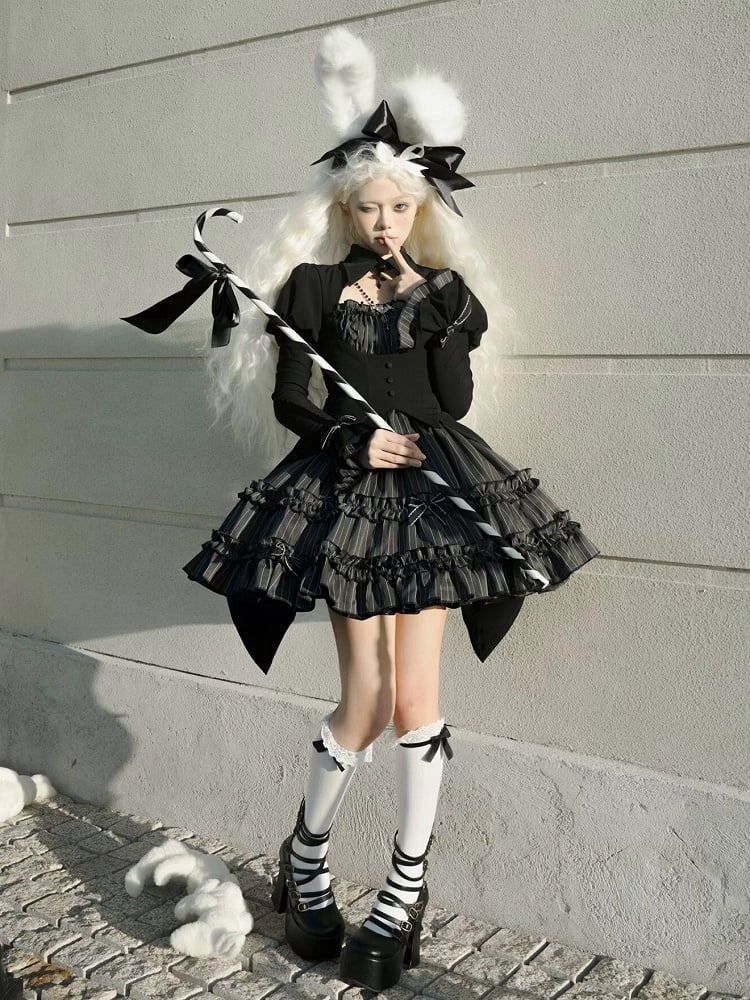 This enchanting dress features a unique bolero-style top that gives the illusion of a sophisticated two-piece ensemble. The striking black and gray stripes add a touch of classic gothic charm, while the lace-up detailing at the back ensures a perfect fit, this dress is perfect for those who adore the darker side of Lolita fashion.