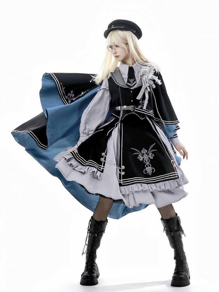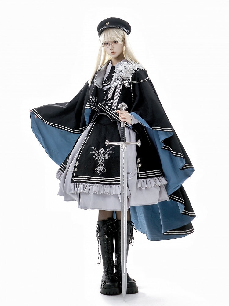 The ensemble is completed with a black skirt, beautifully embroidered with cross motifs and accented with chic chain details, creating a perfect blend of lolita grace and military flair.
