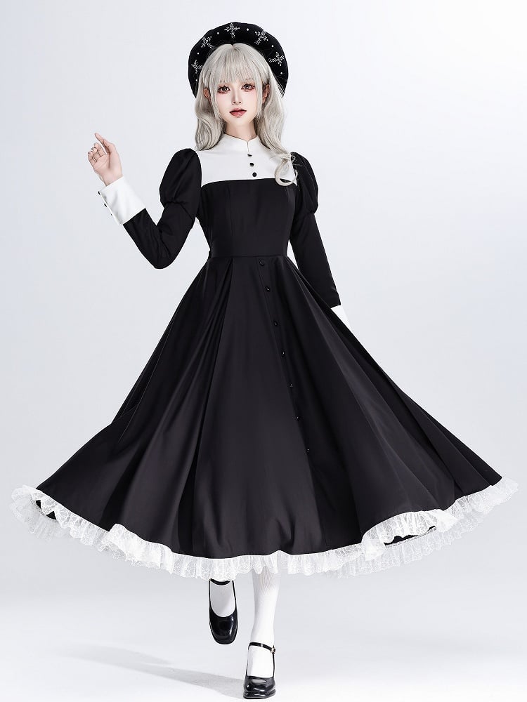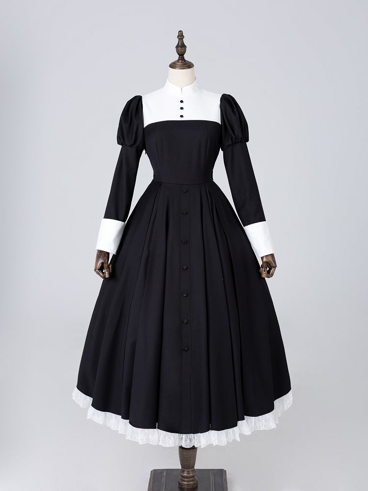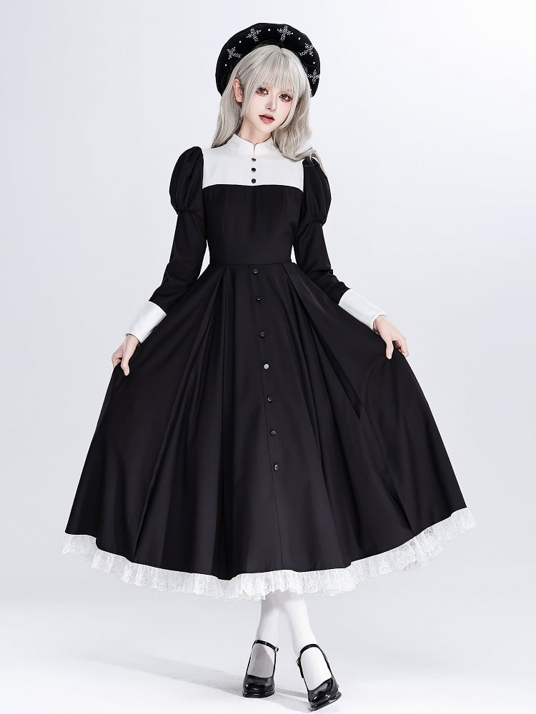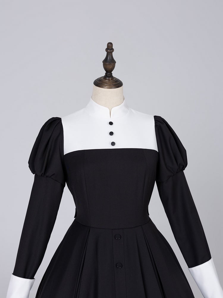This dress features a sophisticated mandarin collar and gracefully flowing Juliette sleeves, embodying a unique fusion of traditional and modern styles. The side zipper and back button closure ensure ease of wear, while the decorative buttons adorning the front skirt add a touch of intricate detail. Crafted with care, this dress is ideal for those who appreciate the delicate balance of elegance and distinctive Lolita fashion.