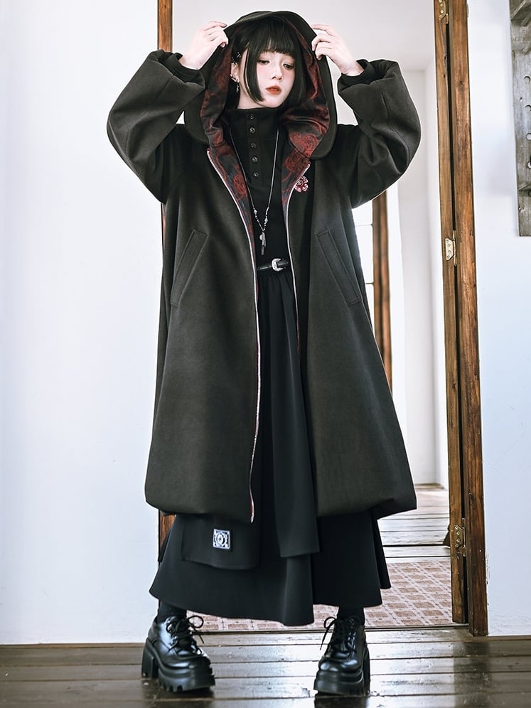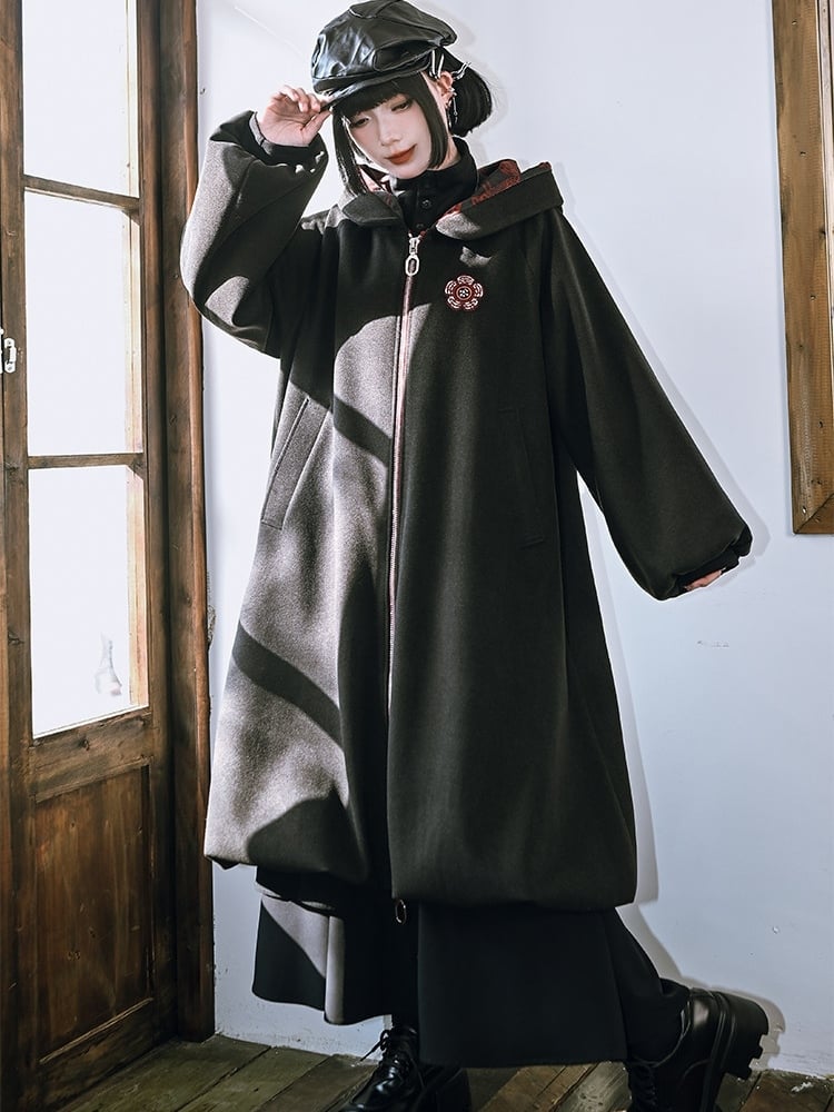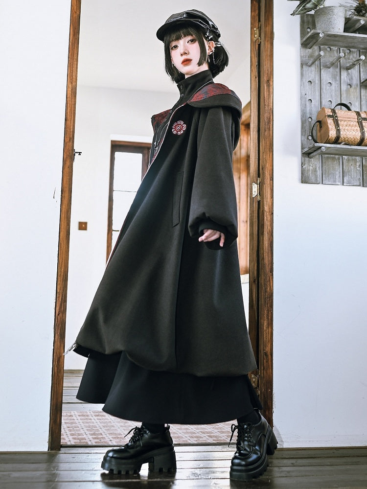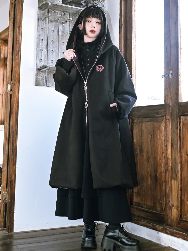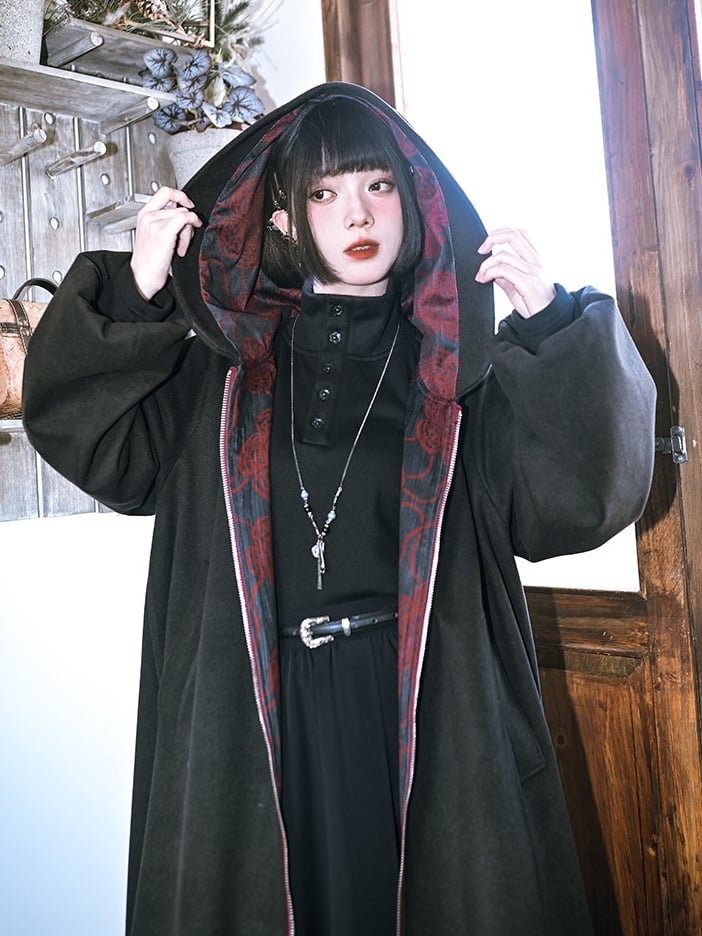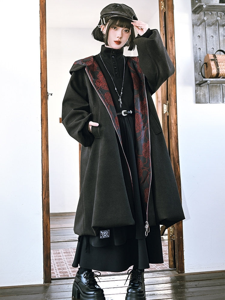 This striking coat effortlessly merges gothic allure with modern flair. Featuring exquisite floral embroidery on the exterior, it boasts a durable double-ended zipper and convenient side pockets. The interior is lined with plush fabric for added warmth and comfort. The coat is designed with a unique bubble hem and sleeves, adding a touch of whimsical elegance to its bold silhouette.
