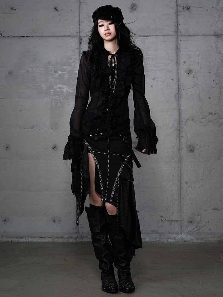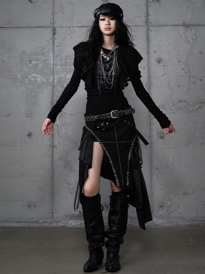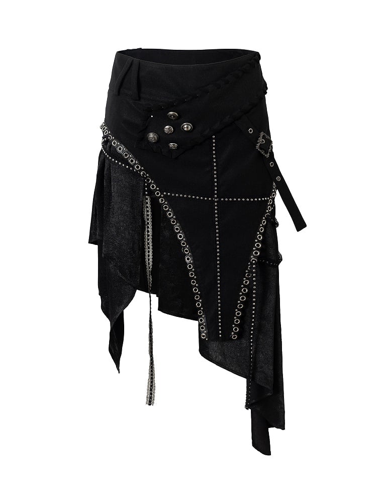 Vintage Gothic Punk Black Handkerchief Hem Skirt: This striking A-line skirt features an asymmetrical handkerchief hem with lengths cascading from knee to calf. Crafted from luxe satin with PU panels, it boasts metal eyelets, buckles, and stud embellishments for an edgy finish. The mid-rise design and open slits elegantly reveal the legs, while offering a structured, non-stretch fit.