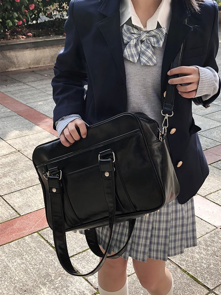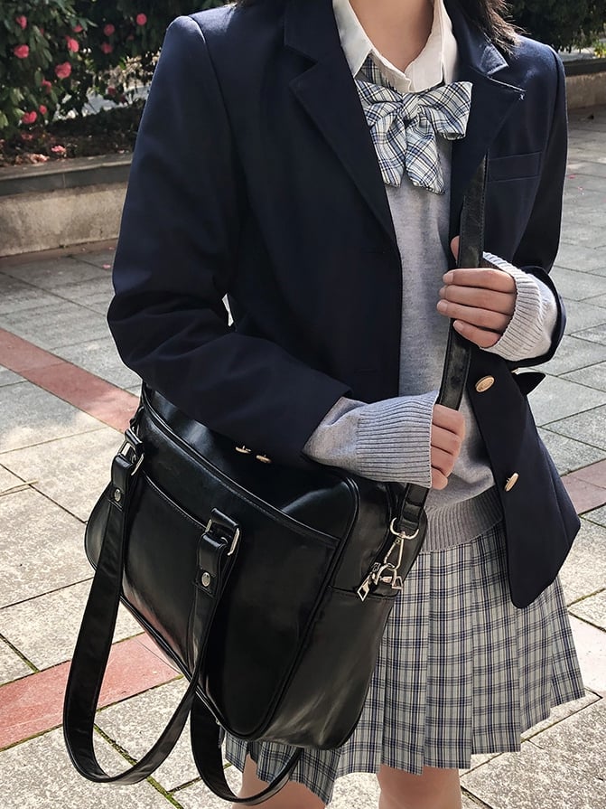 Elevate your style with this chic black JK uniform bag, designed for ultimate versatility. Whether you're heading to class or a casual outing, this bag has you covered with three stylish carrying options: handheld, crossbody, and shoulder. Crafted for both practicality and fashion, its spacious interior accommodates your essentials effortlessly, making it a must-have accessory for any JK uniform enthusiast. Perfectly blending functionality with the timeless allure of JK fashion, this bag is an essential addition to your wardrobe.
