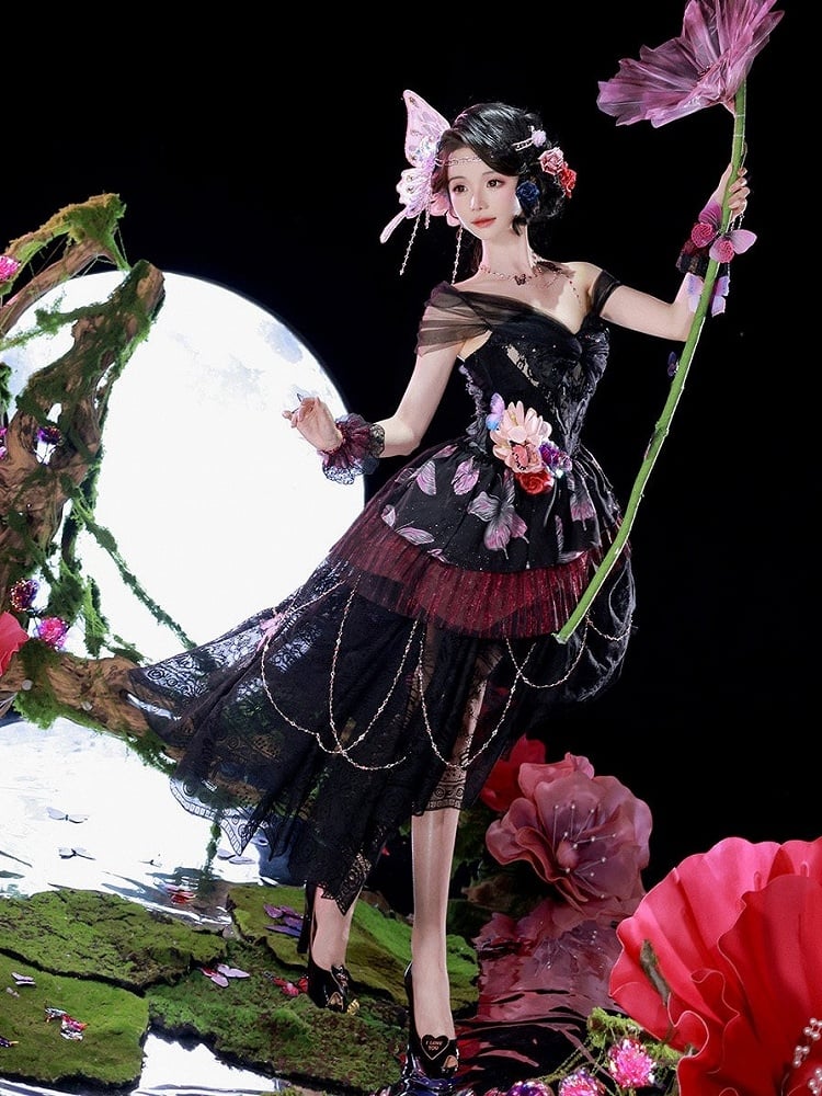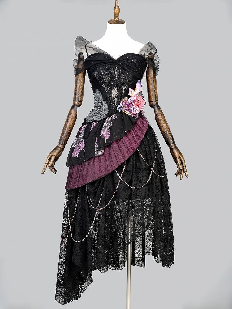 Crafted from elegant black lace, this dress features a delicate butterfly print that adds a whimsical touch to your ensemble. The striking purple floral accents provide a charming contrast, creating a harmonious blend of colors. Dangling chains add a hint of sophistication. This off shoulder dress is perfect for those who enjoy blending classic Lolita style with modern style.