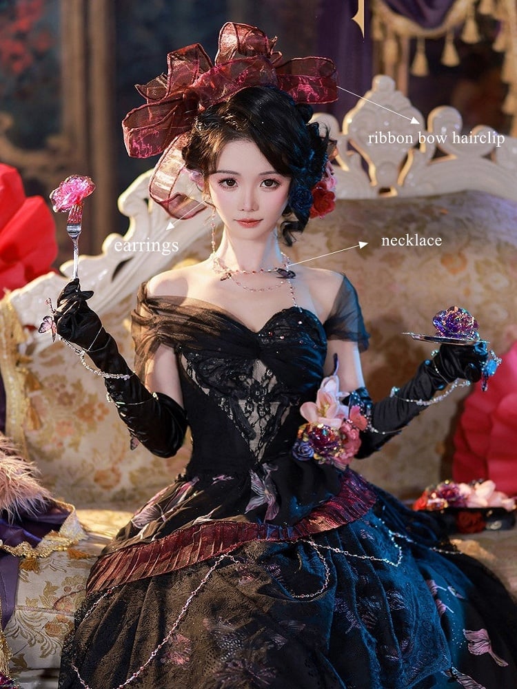 This exquisite Lolita set perfectly blends Gothic charm with refined charm. This stunning black lace off shoulder dress, adorned with flowers, exudes a mysterious and elegant aura. Paired with a butterfly print skirt, it enhances the layering and is perfect for creating charming contours. Birdcage Petticoat adds fluffiness to your outfit. Two different styles of hairclips to suit your mood - each designed to perfectly match the overall look. This set comes with exquisite necklaces and earrings, as well as a pair of cuffs, all carefully crafted to enhance the charming theme of the dress.