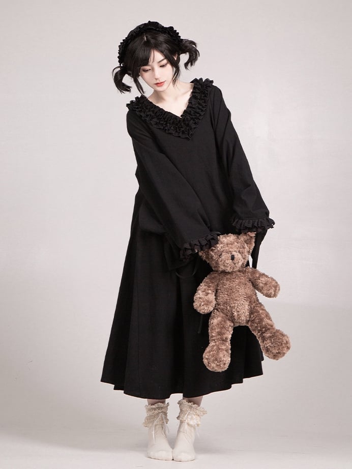 This long version is a perfect blend of traditional Japanese elements and modern Lolita style, the dress features a charming v-neck adorned with delicate ruffles, long sleeves are designed with a unique wa-style, and the cuffs are embellished with intricate ruffle trim, enhancing the overall aesthetic. A detachable waist string, allowing you to cinch the waist to your preference and create a beautiful silhouette.