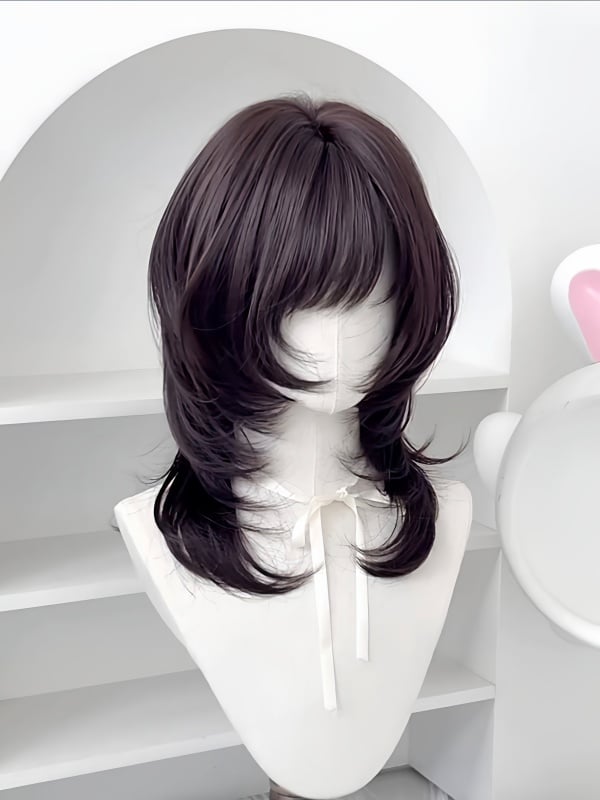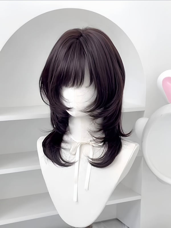 Black Tea 45CM Hime Cut Short Wavy Wig with Bangs creates a sweet-edgy mature look with premium black tea, layered hime cut short waves and face-slimming bangs, fitting various outfits.