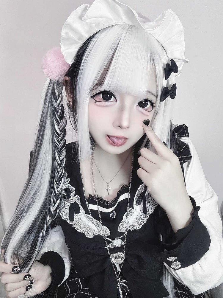 This wig features black & white highlights, with 80CM long straight hair, Hime Cut (princess cut) and bangs, combining coolness and Japanese style.