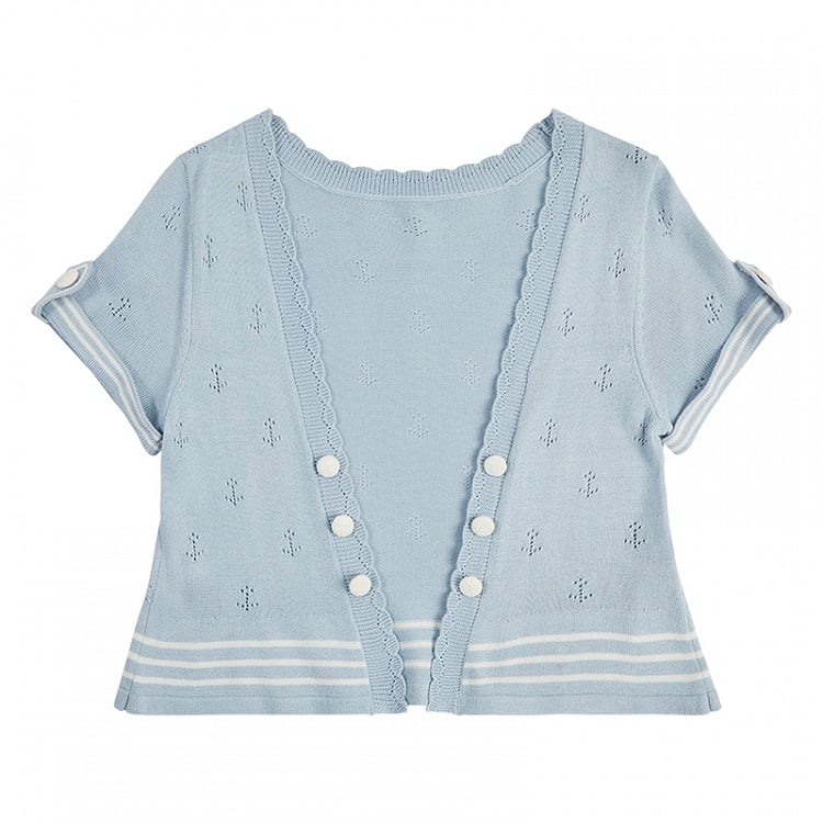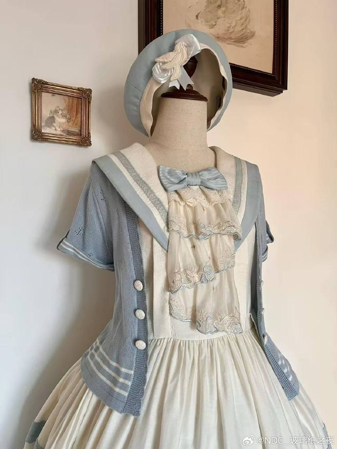 Crafted from a delicate eyelet knit, this piece effortlessly combines a elegant-inspired aesthetic with modern comfort. The intricate eyelet pattern adds a touch of elegance, while the soft blue hue brings a serene and whimsical feel. Perfect for layering over your favorite Lolita dress.