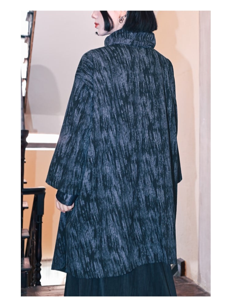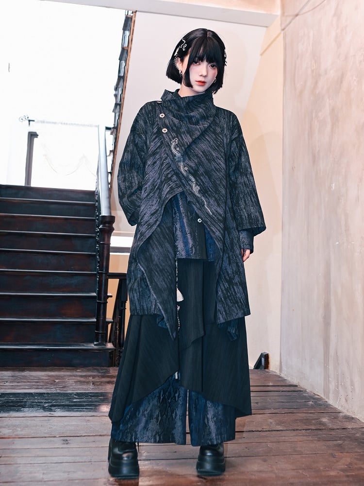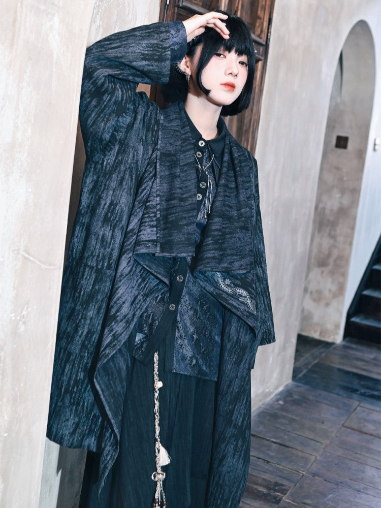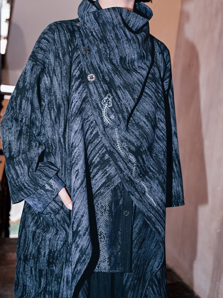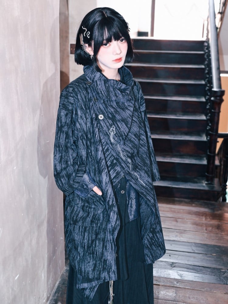 Gothic Cheongsam: A blue gradient mid-length cape jacket featuring a deconstructed design with a left placket secured by metal buttons on the right shoulder, adorned with snake print. It includes side pockets and an asymmetrical cut, blending traditional Chinese elements with vintage flair.