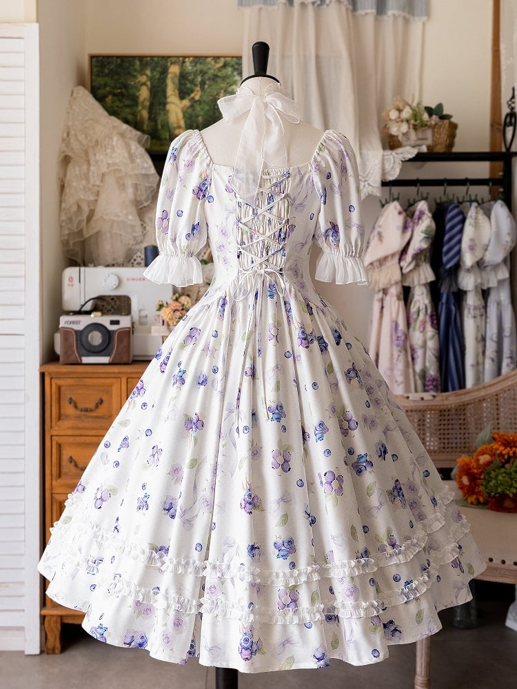 This delightful retro dress features a charming blueberry print and a flattering square neckline, perfect for lovers of vintage-inspired fashion. The dress is designed with a slim waist and adjustable lace-up at the back to ensure a comfortable fit. With its unique design and figure-enhancing silhouette, this dress is a must-have for anyone looking to add a touch of retro elegance to their wardrobe.