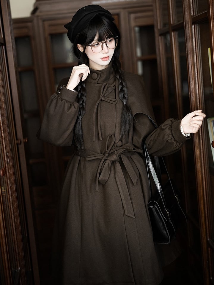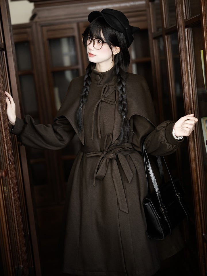 This stylish coat features a false-two-piece cape design with integrated shoulder pads for a structured and elegant silhouette. The belt is detachable, allowing you to adjust and cinch the waist for a flattering fit. Concealed pockets on both sides of the waist offer practical storage while maintaining a sleek appearance. The outer layer is crafted from fine, thin woolen fabric, while the interior is lined with quilted cotton for added warmth and comfort.