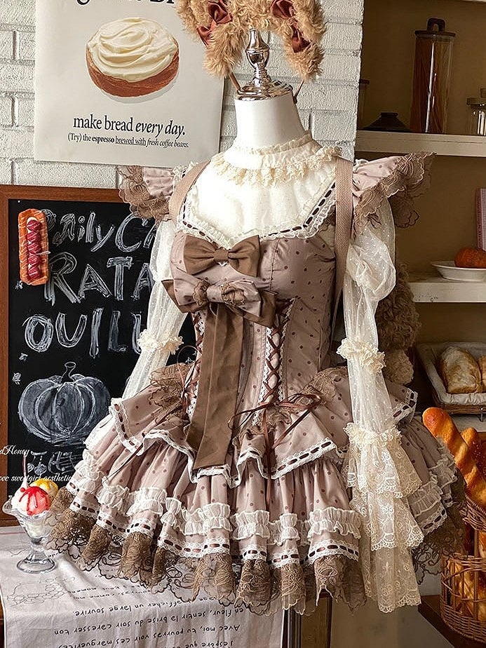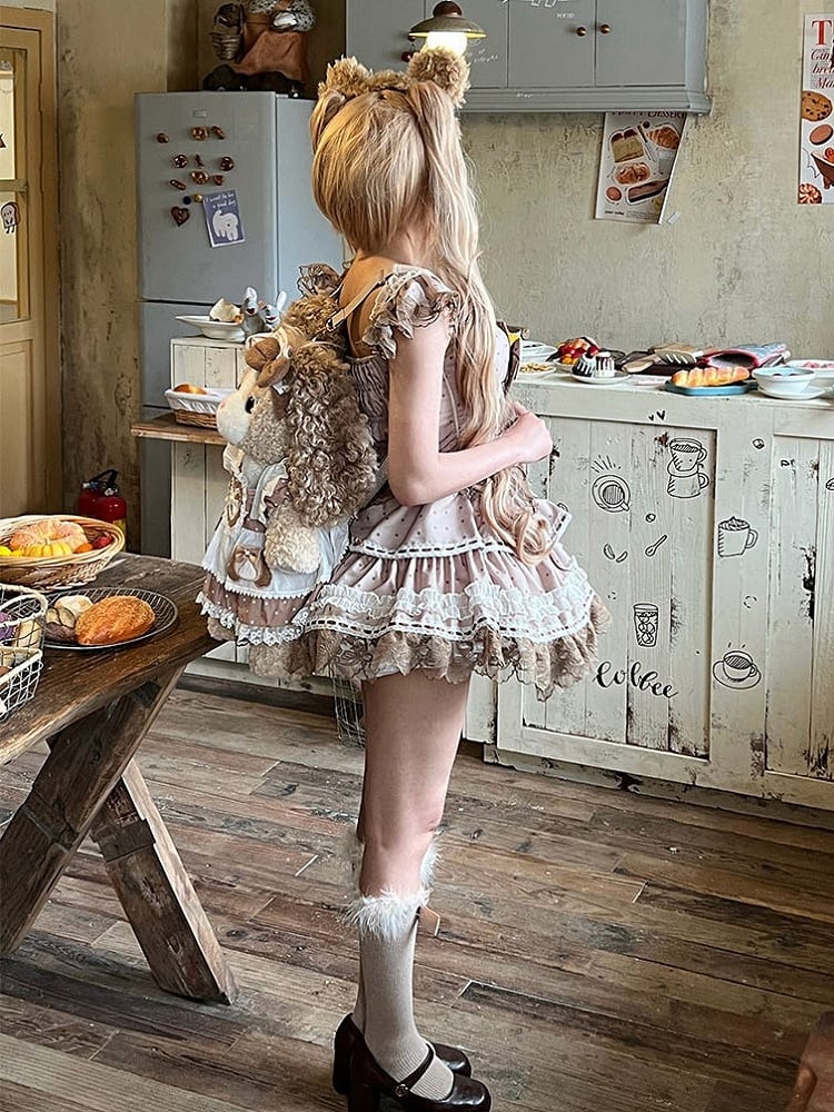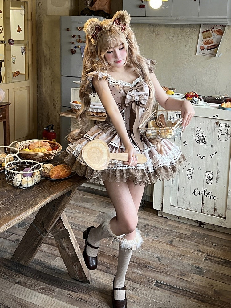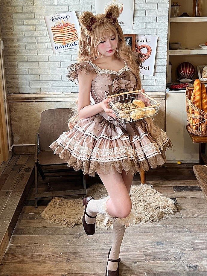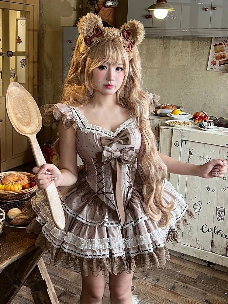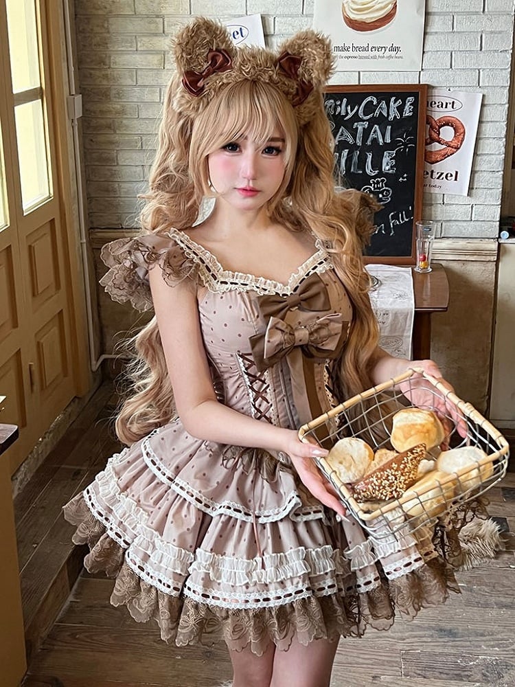Crafted in a charming brown hue, adorned with playful polka dots, this dress exudes a timeless appeal. The delicate flutter sleeves add a whimsical touch, perfect for twirling on the dance floor or making a statement at any event. Intricate lace trim accents the dress, enhancing its allure, while the sweet bows add a delightful finishing touch.