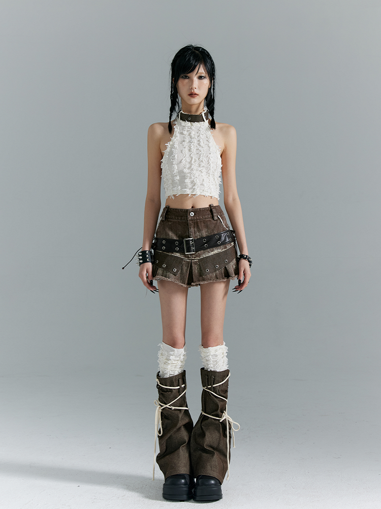 Vintage Punk Brown Denim Mini Skirt: This washed-out A-line skirt features a frayed hem and is crafted from mid-rise denim with a rebellious flair. The front showcases a black adjustable metal buckle belt, complemented by brown patchwork with metal studs. A pleated design adds texture, while a black pocket adorns the right rear, perfect for an edgy, stylish look.