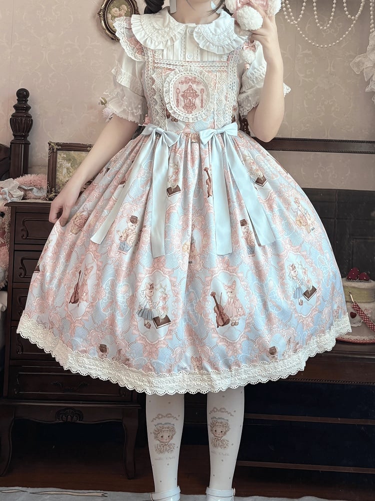 This enchanting piece features an intricate print of adorable bunnies, elegant violins, quaint flower baskets, and charming little birds, all set against a soft blue backdrop. The dress is designed with a high waist for a flattering silhouette and includes a shirred back for added comfort and flexibility. The front waist is adorned with two detachable bowknots, allowing for customizable styling options.