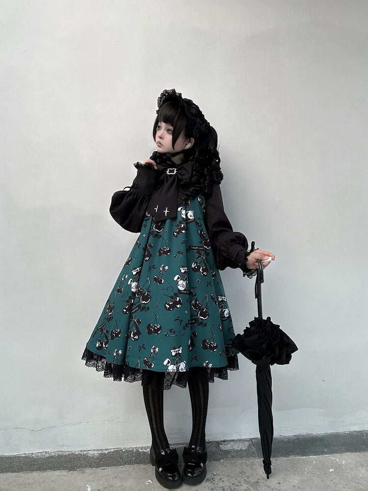 This unique OP (one-piece) dress perfectly embodies the Gothic and eccentric doll-like aesthetic. Designed in a charming doll-inspired A-line silhouette, it offers a classic yet distinctive Lolita look with a dark twist. Adorned with a captivating print of cherries, bear and rabbit dolls, the fabric tells a story of whimsical darkness. Finished with delicate lace trim at the hem, this dress seamlessly blends innocence with a gothic edge.