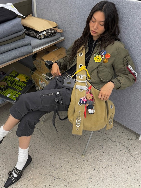 Rock our Chic Moon Brown Punk Tote Bag for edgy elegance. This punk-style bag features an adjustable strap (shoulder/crossbody wear), metal chains, and studs. Perfect for concerts or daily bold statements.