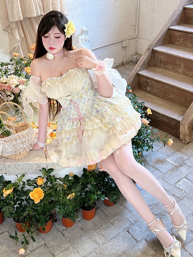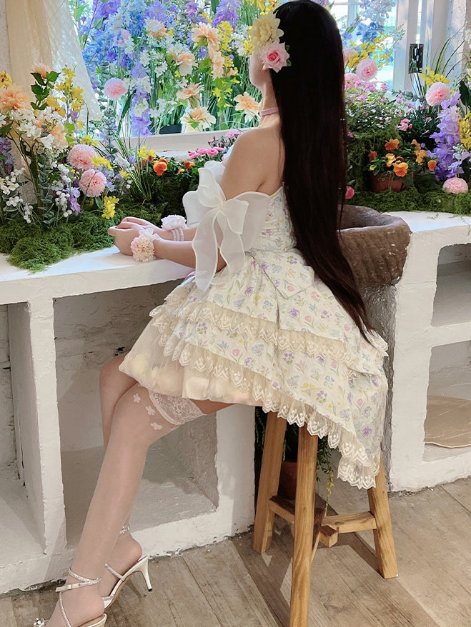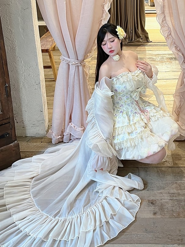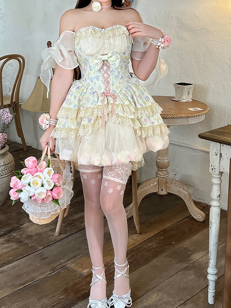 Tulip Print Princess Dress Set, featuring a tulip print strapless top with a ruffle sweetheart neckline and a tiered hi-lo lace hem.