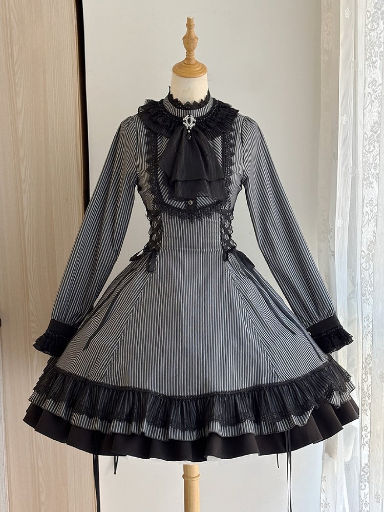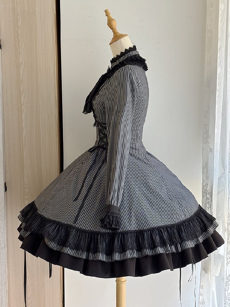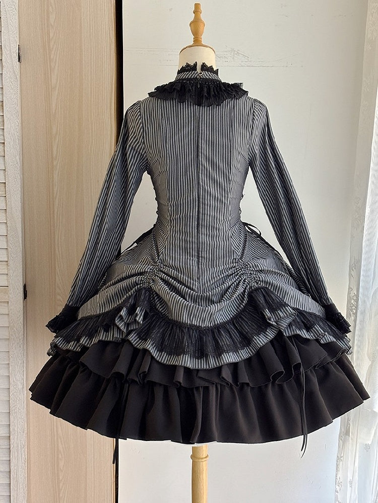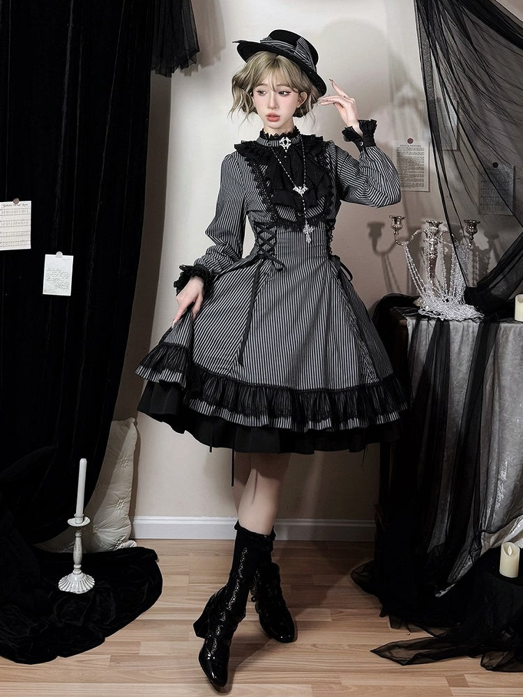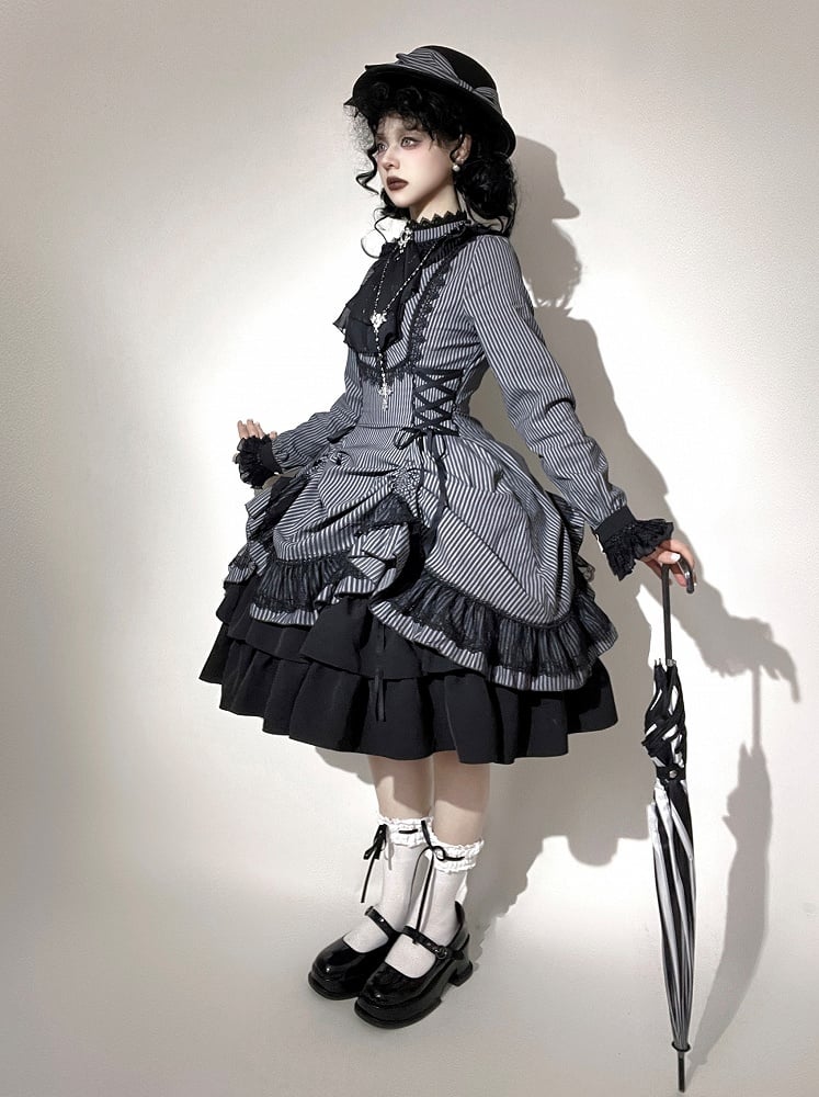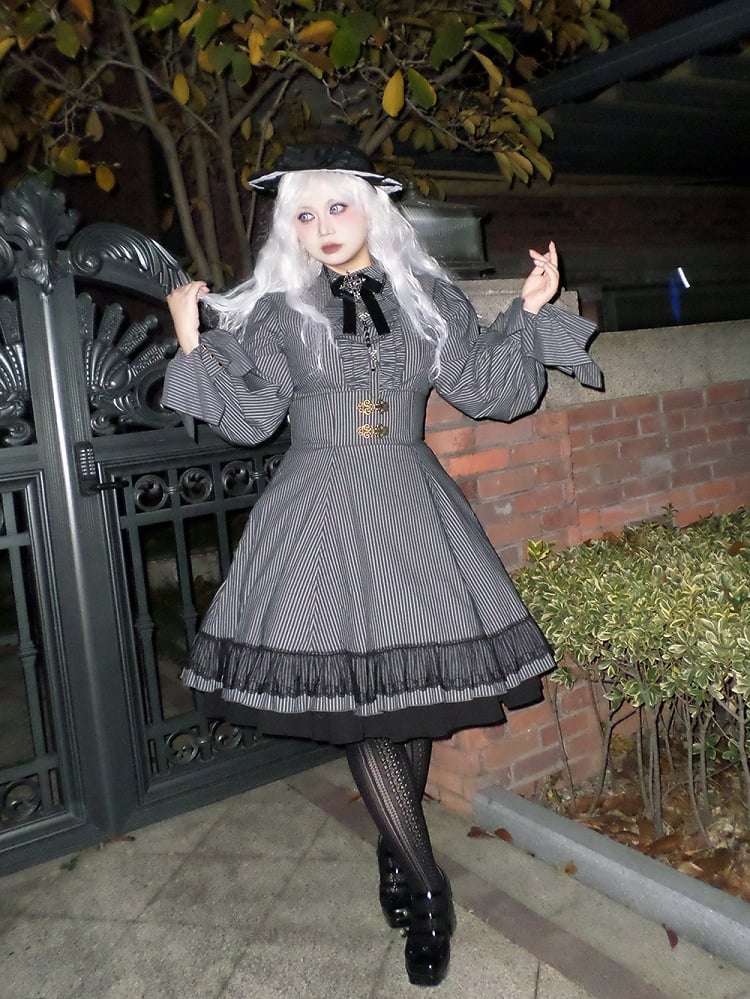 Embrace timeless elegance with this classic pinstripe Gothic Lolita dress. Featuring a charming ruff collar and intricate lace trim details, this dress perfectly blends the sophistication of Gothic fashion with the classic allure of Lolita style.