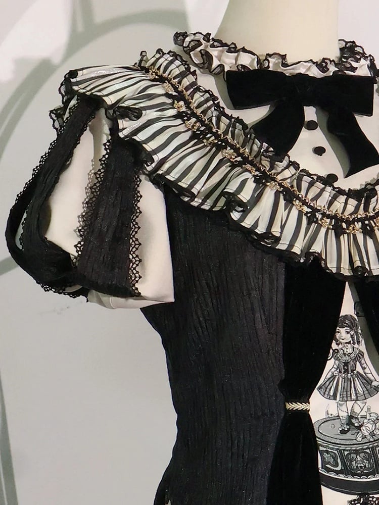 Full Set: A ruffle striped trim puff-sleeve top, a hi-lo striped skirt, a pair of floral-print bubble bloomers, a black self-tie petticoat, an asymmetrical diamond-pattern clown hat, a pair of detachable sleeves, and a doll-pattern badge.