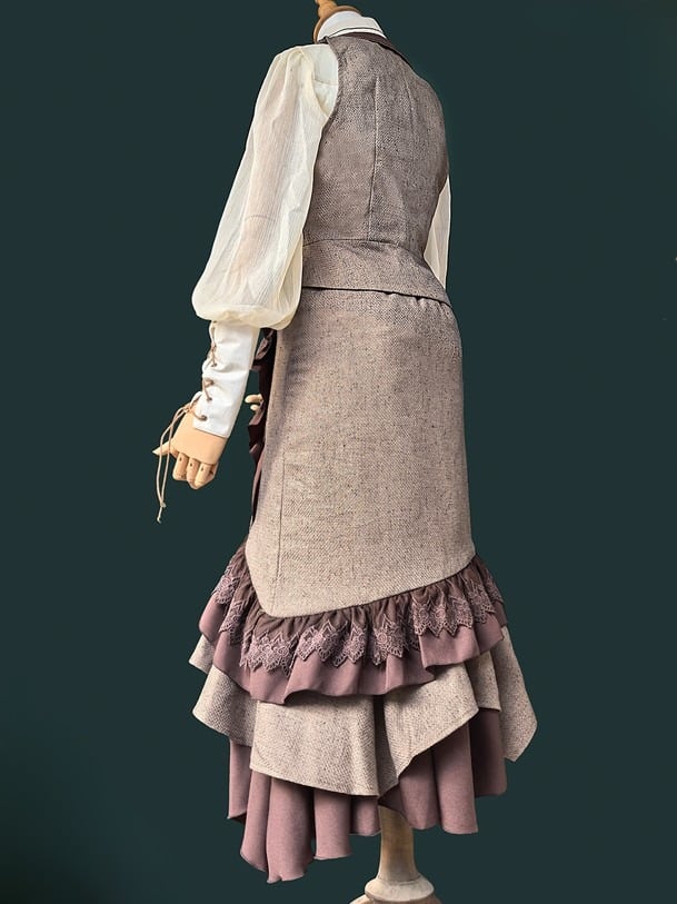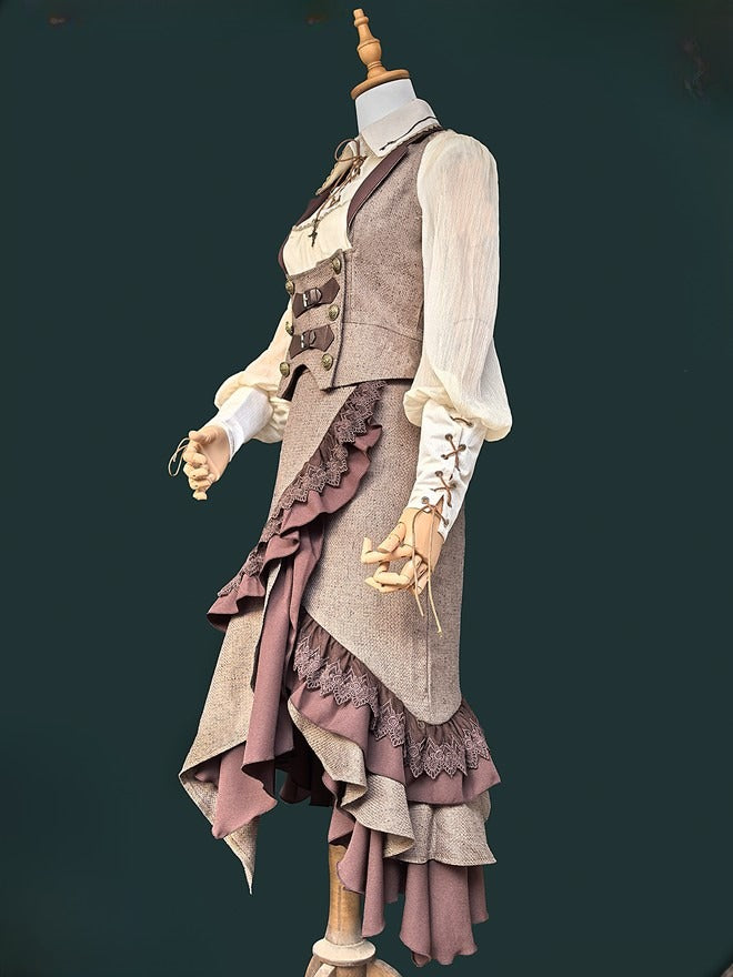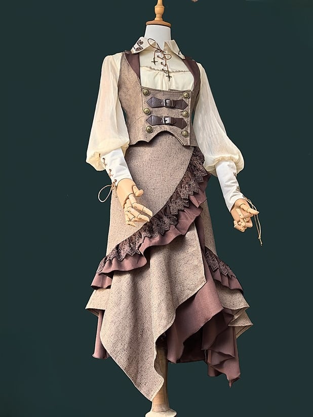 This exquisite piece combines the whimsical charm of Lolita fashion with the edgy allure of steampunk aesthetics. Crafted in a coffee hue, the dress features an intricate asymmetrical design that adds a dynamic flair to your ensemble. Delicate lace trims adorn the edges, offering a touch of vintage sophistication.The dress is tailored to perfection, with layered ruffles cascading gracefully, creating a voluminous silhouette that captures the essence of Lolita style. The steampunk influence is evident in the subtle details.