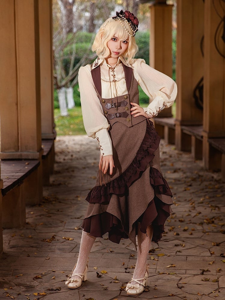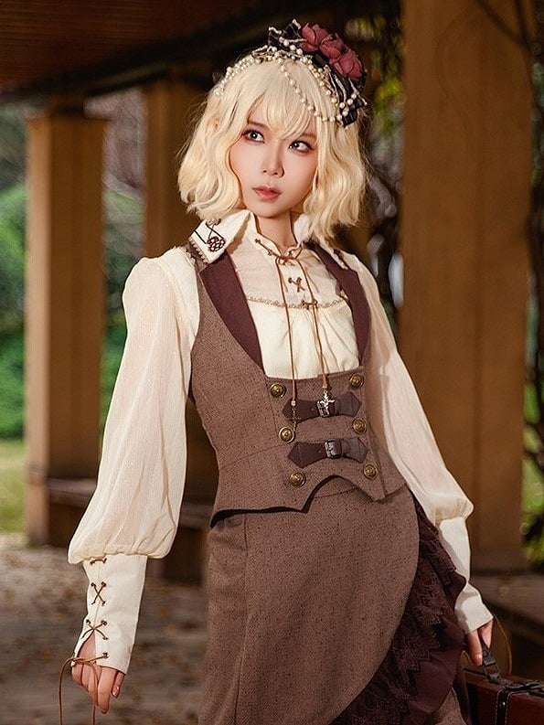 Step into a world of whimsical elegance with this Steampunk Lolita waistcoat in a coffee brown. This unique piece combines the structured elements of steampunk fashion with the delicate charm of Lolita style. The waistcoat features intricate button detailing, adding a touch of vintage sophistication.