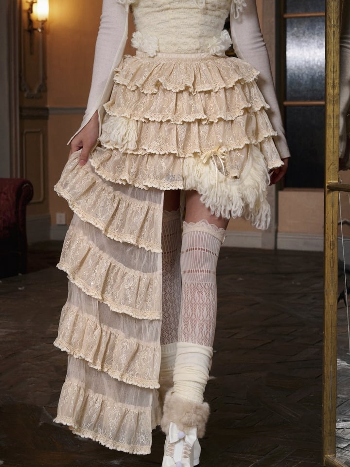 Crafted with multiple layers of intricate heavy lace as its core, it is further enhanced with shimmering sequins for added glamour. The skirt is adorned with fluffy fuzzy trims nestled between the layers and along the side hem, a charming bow decorates the side hem, adding a touch of whimsy. The lower part of the skirt features an innovative design of ruffled tulle and jacquard lace fabrics, arranged in an irregular layered hem that creates a captivating and dynamic silhouette.