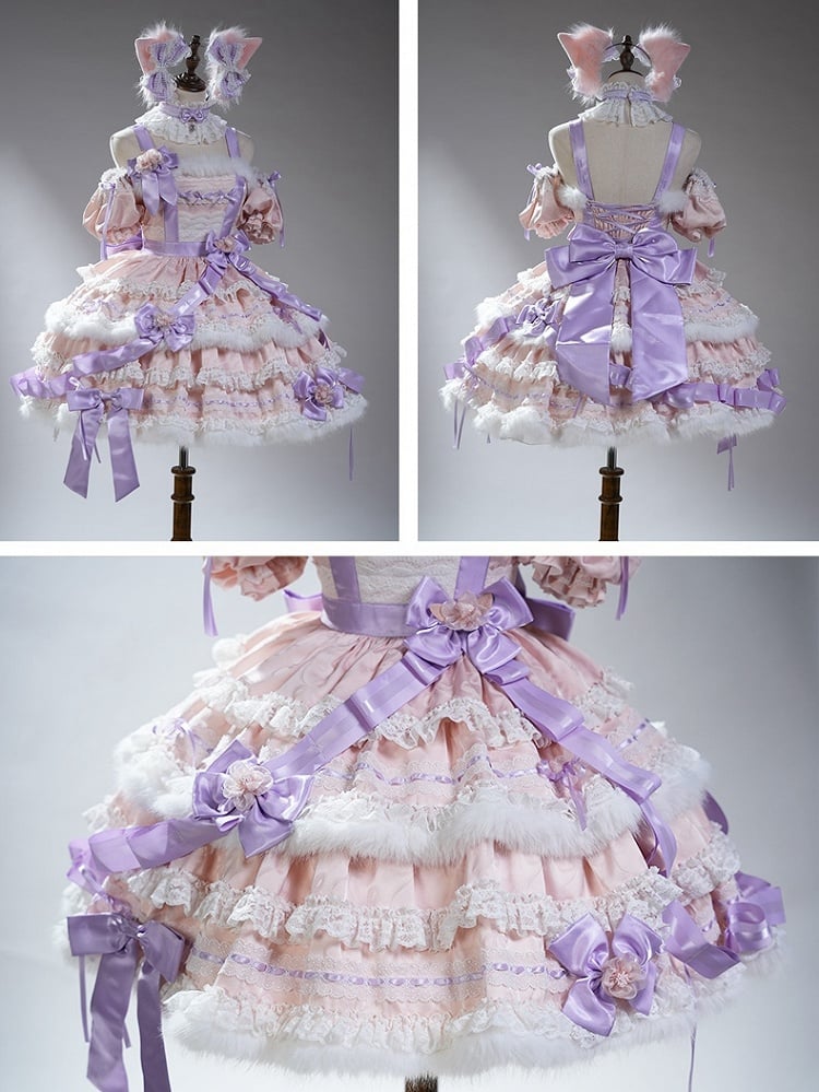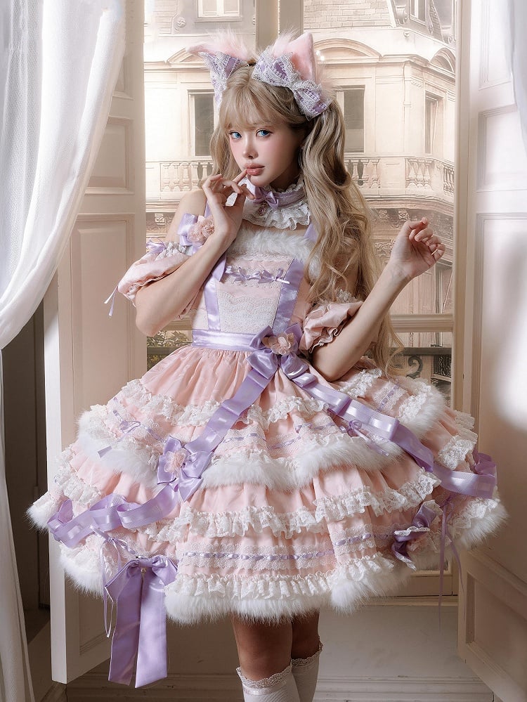 This delightful frock features a soft pink base adorned with lavender accents, creating a dreamy and feminine color palette. The dress is meticulously detailed with multiple layers of ruffles, each trimmed with delicate lace edges, fluffy white fur trims enhance the skirt's layers, providing a cozy and luxurious texture.