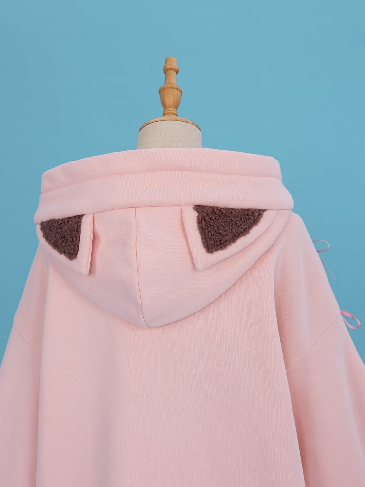 This adorable piece features a charming sleeping kitty print nestled on a crescent moon, set against a soft pink backdrop. The hollow-out sleeves are adorned with delicate pink bows, crafted with a cozy brown fleece pouch front pocket, it's perfect for keeping your hands warm or storing small essentials. The fleece hemline and cuffs ensure a snug fit, making this hoodie an ideal choice for both lounging at home and casual outings. Dive into a world of cuteness and warmth with this must-have addition to your kawaii wardrobe.