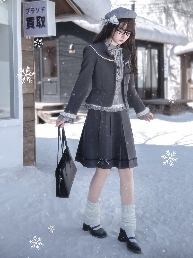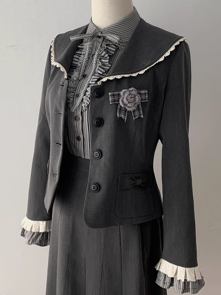 This blazer is a Jirai Kei piece, with a cool gray base. The flat collar decor softens the sharpness of the suit, creating a sweet-gloomy contrast; the structured version fits the body shape well. It can be paired with the same style skirt for a complete look, or mixed with innerwear to add layers to daily outfits, making it a practical piece with high style adaptability.