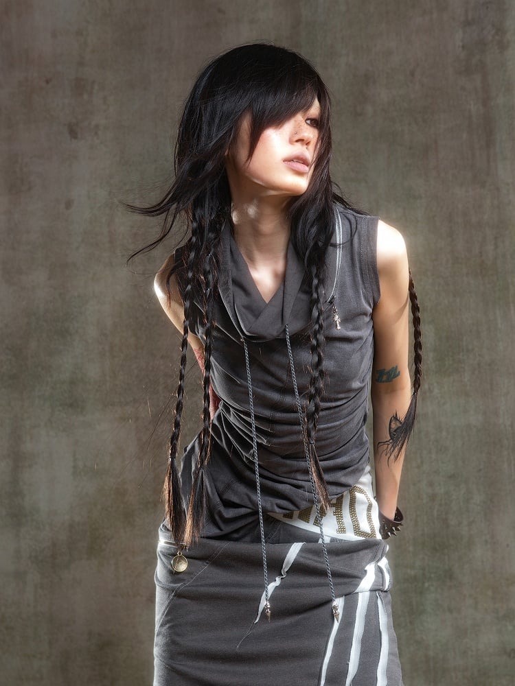 Asymmetrical ruched multi-wear sleeveless vest featuring drawstrings with pointed charms at the collar. The neckline is accented with a wrap-around zipper adorned with cross charms. Designed with a handkerchief hem, this piece offers a punk street style with a retro vibe, perfect for versatile millennium summer looks.