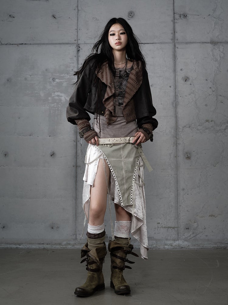 Dark Green Vintage Knit Hoodie - A deconstructed masterpiece featuring suede paneling along the placket and cuffs. This cropped, loose-fit jacket boasts metal buckle strap detailing, and is finished with striking metal buttons for a touch of regal charm. Non-stretch fabric adds to its structured elegance.