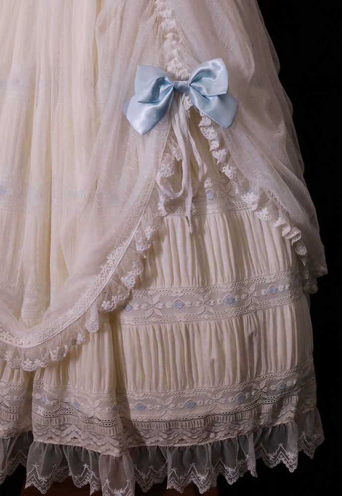Features: Removable bowknots at shoulders and hem, removable waistband, tiered ruffles, zipper closure at back.