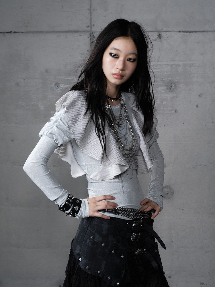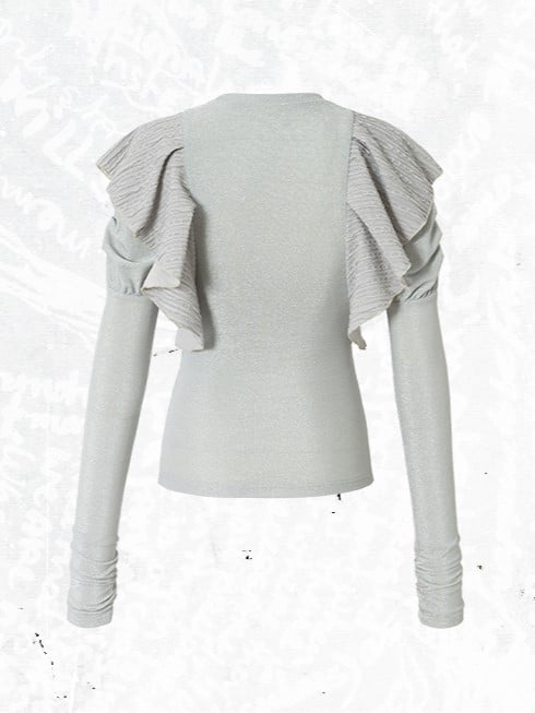 Elevate your wardrobe with this dusty blue top featuring a dreamy chain print. Designed with flattering puff sleeves complemented by pleated flutter overlays, this round-neck long sleeve is perfect for layering. Its soft, medium-stretch fabric ensures a comfortable, slimming fit.