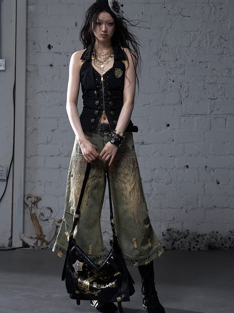 Unleash your inner rebel with this striking Punk Distressed PVC Crossbody Bag. Designed for those who dare to stand out, this bag features a unique distressed finish with eye-catching gold foil accents that add a touch of grunge glamour.