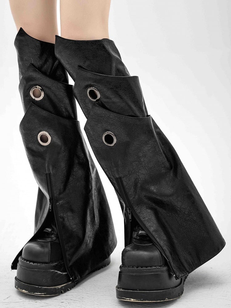 Unleash your inner warrior with these striking black PU leg warmers, designed to add a bold statement to any outfit. Featuring a unique three-layered armor design, these leg warmers are crafted from premium black textured faux leather, offering a sophisticated yet edgy look. These leg warmers are thoughtfully designed with a versatile zip cuff, allowing them to accommodate various shoe styles effortlessly. The convenience of a rear zipper ensures easy wearability and removal.
