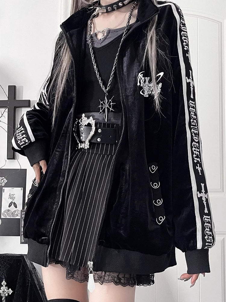 A dark aesthetic, loose-fit black velvet tracksuit jacket featuring a zip closure and a large gray Gothic cross and lettering print on the back. The sleeves are accented with white woven tape adorned with Gothic fonts and cross motifs. The left chest showcases a Gothic print, while the slant pockets are embellished with metal eyelets and D-ring accents.