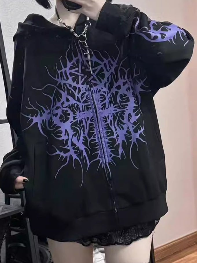 This black hoodie features a bold purple cross design, crafted from premium fabric for comfort and edge. The zip-up design with an attached hood offers versatile layering, perfect for cool-weather styling within a dark aesthetic.
