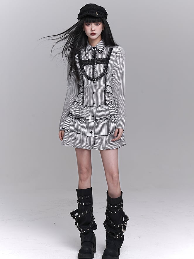 Embrace the perfect blend of edgy and elegant with our Gothic Striped Cross Lace Shirt Dress. This striking piece features bold black and white stripes that create a dramatic visual impact. The delicate lace detailing adds a touch of femininity, while the cross motif imbues the dress with a gothic charm.