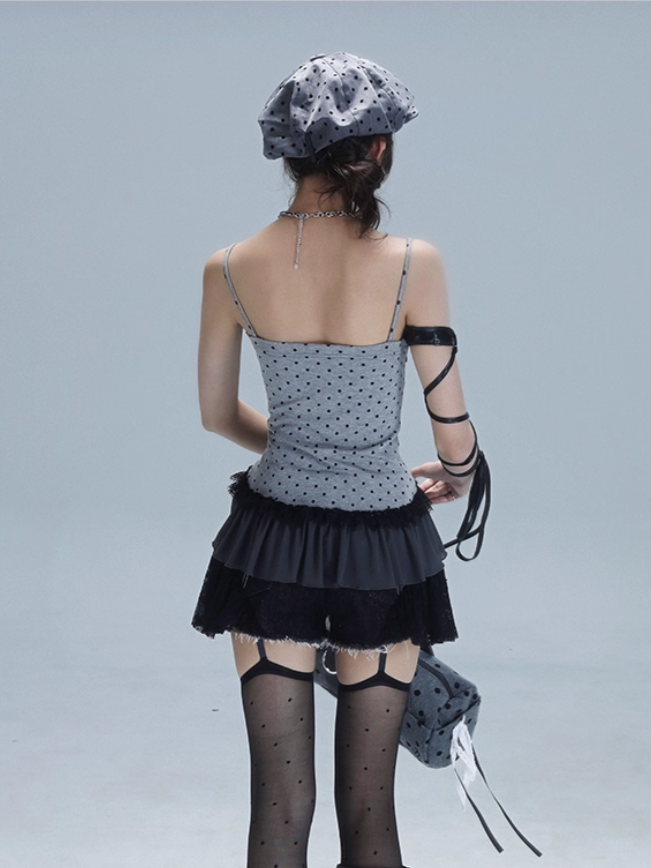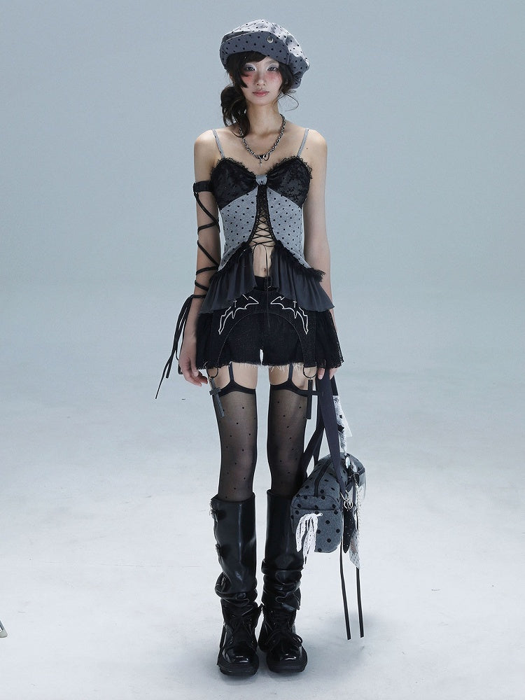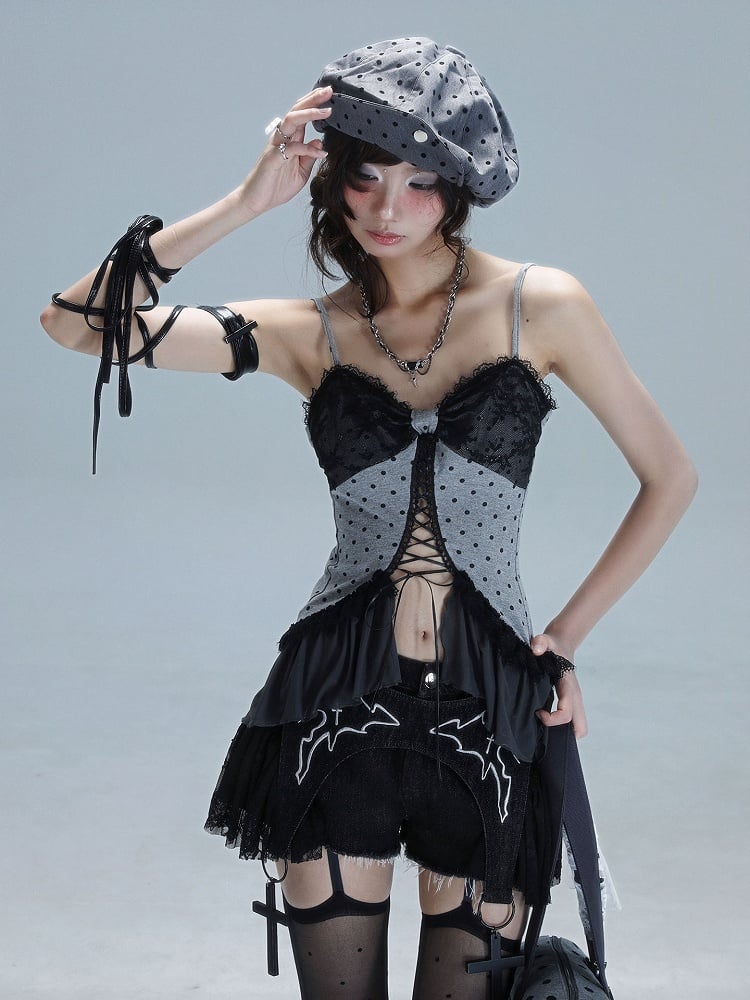 Gray Cami Top with Black Polka Dots: Featuring a center slit adorned with black crisscross lacing, this top boasts a chic hemline of black lace and ruffled fabric. The bust area is elegantly detailed with black lace cutouts forming a bow-like design, complemented by a black lace-trimmed neckline. Perfect for a Yaya-inspired look.