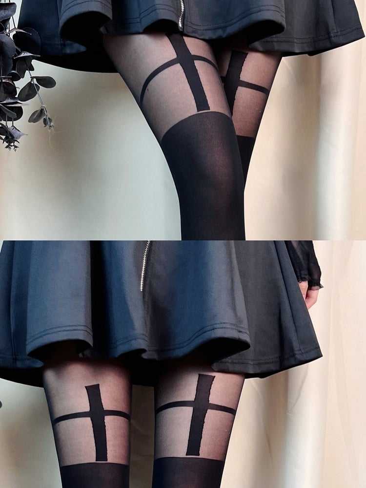 Dark Allure: Sheer Black Thigh-High Semi-sheer Tights with Gothic Cross Detail – Perfect for a Punk-Inspired Night Out!