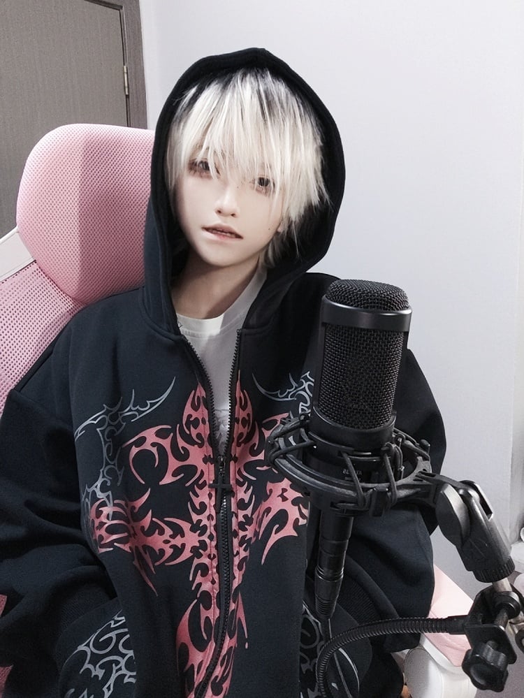 This black hoodie features a bold red cross chest print, crafted from premium fabric for comfort and edge. The zip-up design with an attached hood offers versatile layering, perfect for cool-weather styling within a dark aesthetic.
