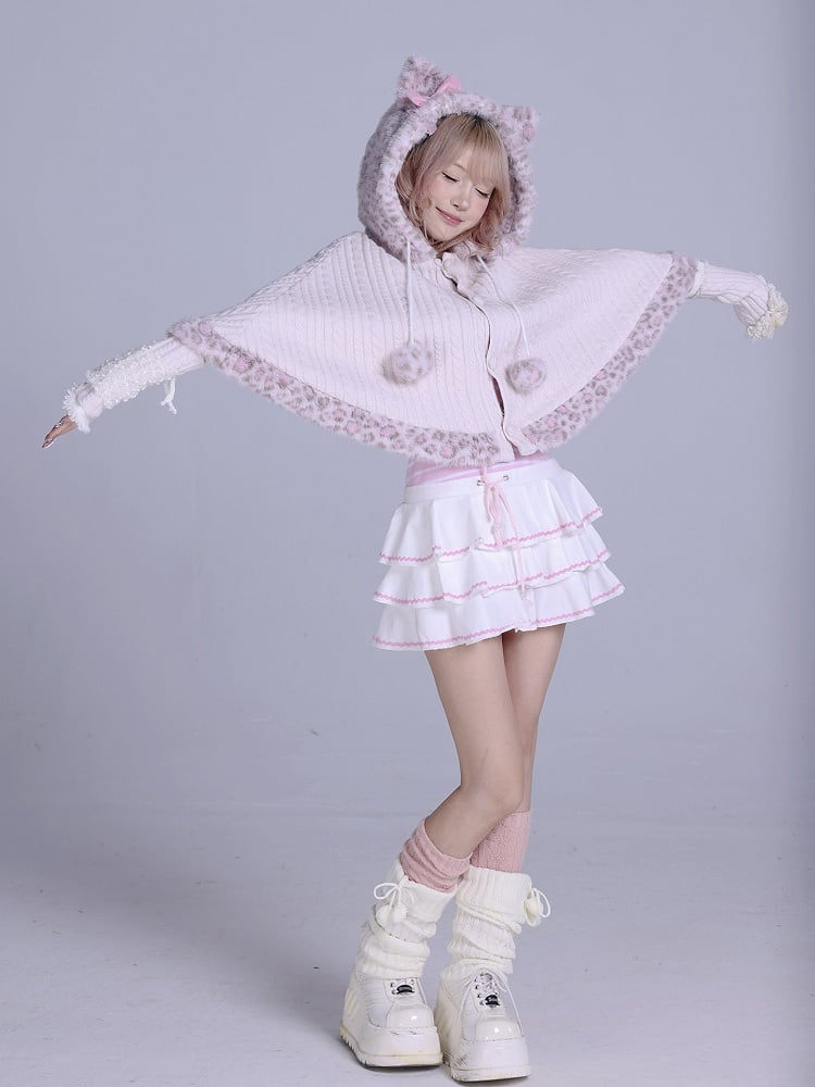 This cape has a knitted build and is edged with leopard print faux fur. The hood includes drawstrings finished with pom-poms. It can be layered over other garments during cooler weather. The piece combines a light color with animal pattern trim.