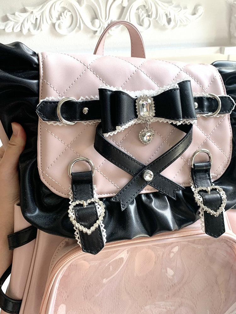 Elevate your style with this adorable Jirai Kei backpack, featuring charming bow accents and sparkling rhinestone embellishments. Perfect for adding a touch of whimsy to any outfit, this dual-strap backpack combines functionality with a playful aesthetic, making it an ideal accessory for both everyday use and special occasions.