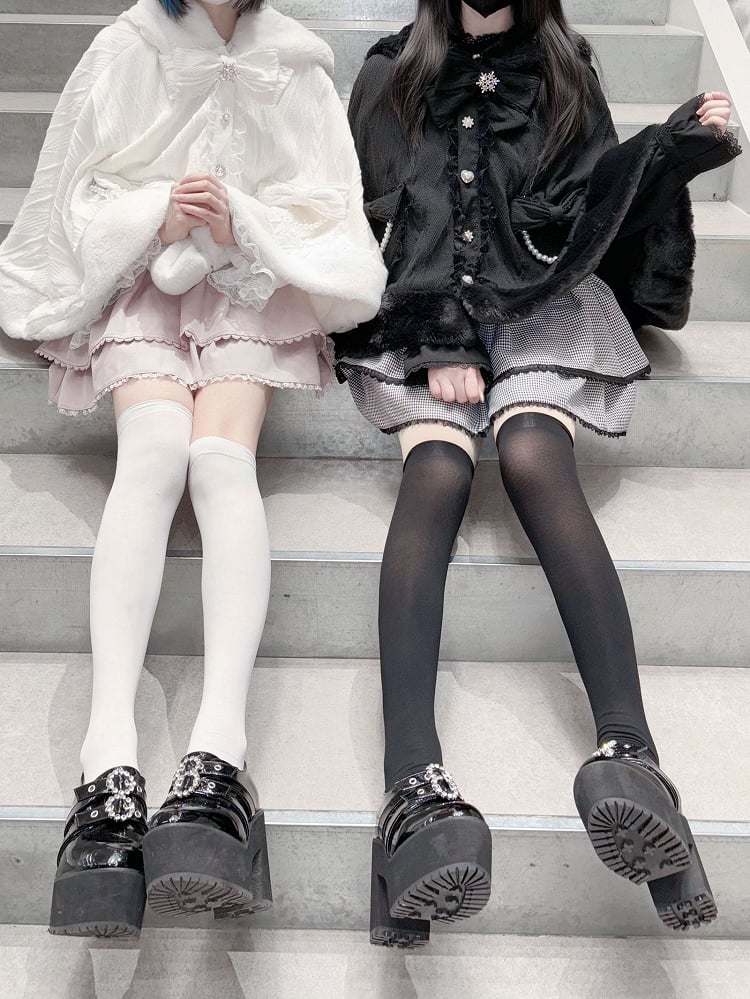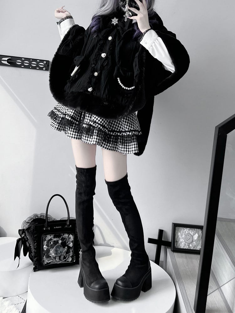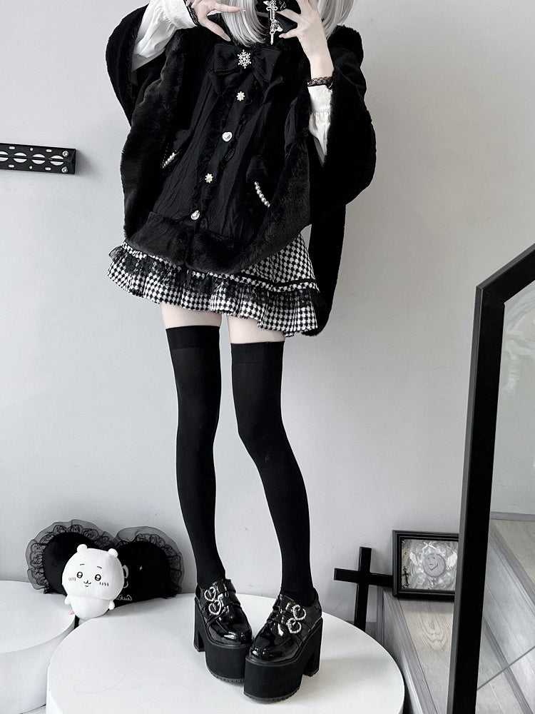 Wrap yourself in whimsical charm with our Jirai Kei-inspired plush cape, available in both elegant black. This cozy cape features delightful bunny ear accents, adding a playful touch to your kawaii wardrobe. Perfect for embracing the cute and mysterious essence of Jirai Kei fashion, this cape is a must-have for any fashion enthusiast looking to make a statement. Ideal for layering over your favorite outfits, it combines comfort and style effortlessly.