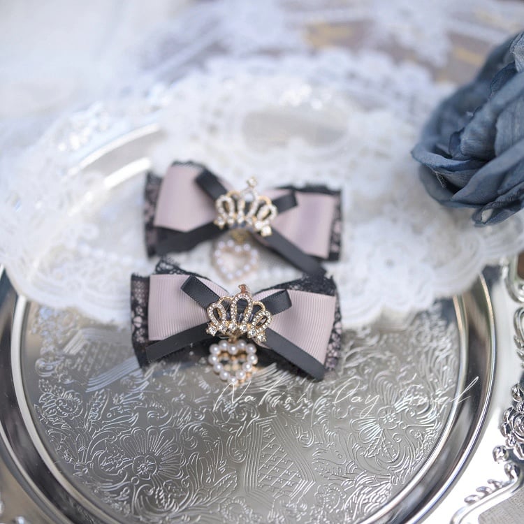 Elevate your Jirai Kei style with this exquisite Black/Dusty Pink Lace Hairclips, adorned with a delicate beaded heart charm.